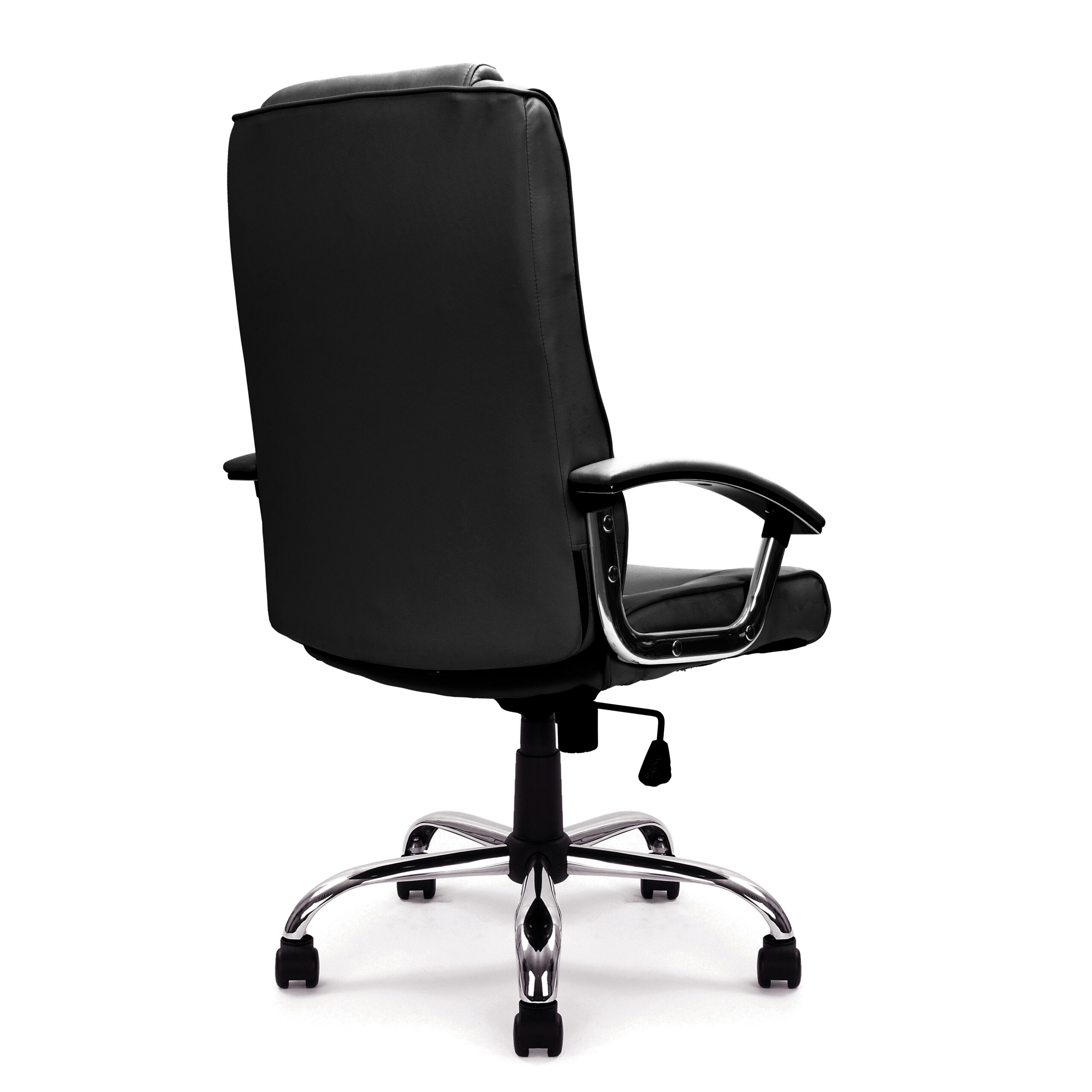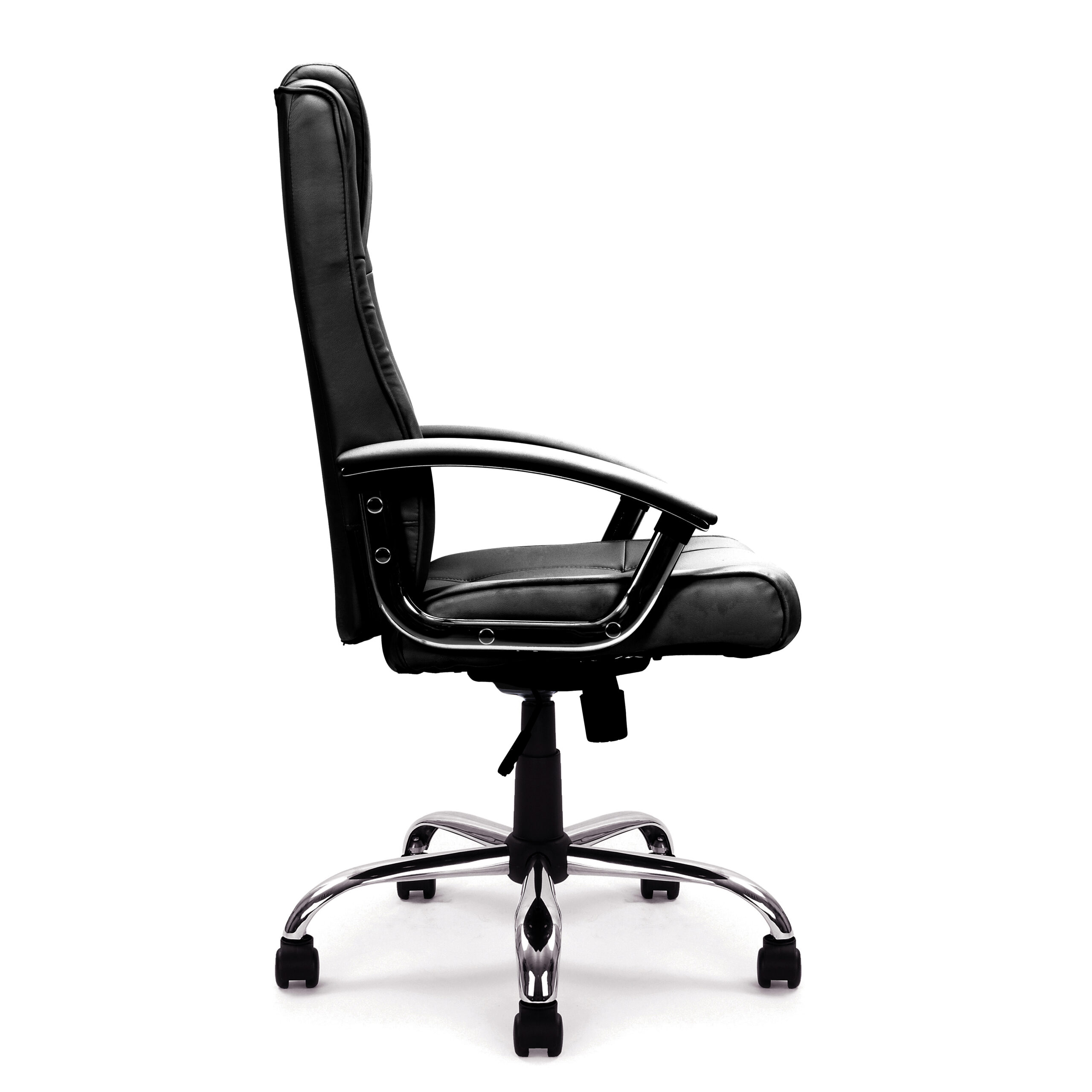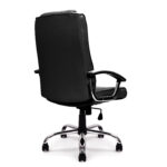 A truly modern classic, this high back Manager chair provides a stylish and contemporary aesthetic as well as a rich feature list – ideal for the professional and home user alike. A generously proportioned seat and backrest with integral headrest and pronounced sculpted lumbar support is stylishly stitched and finished in plush leather faced upholstery. The chair mechanism allows the user to fully recline the chair – adjustable for individual bodyweight (tension control), which can be locked in the upright position and offers easy seat height adjustment via a sturdy gaslift. Contemporary chrome arms with matching padded and upholstered armpads with complementing polished chrome base complete this popular unit.