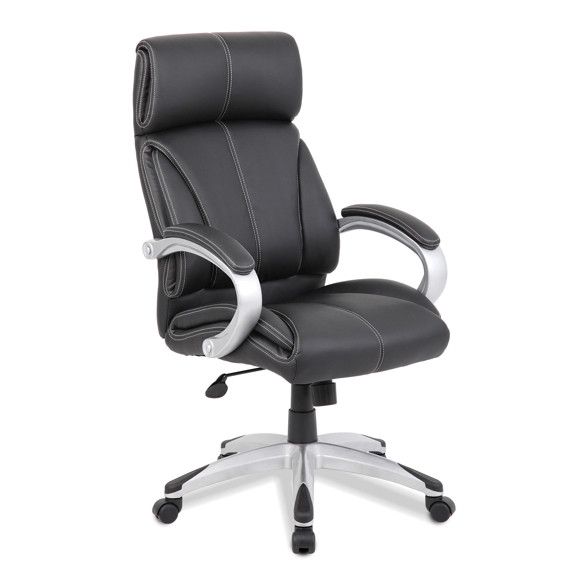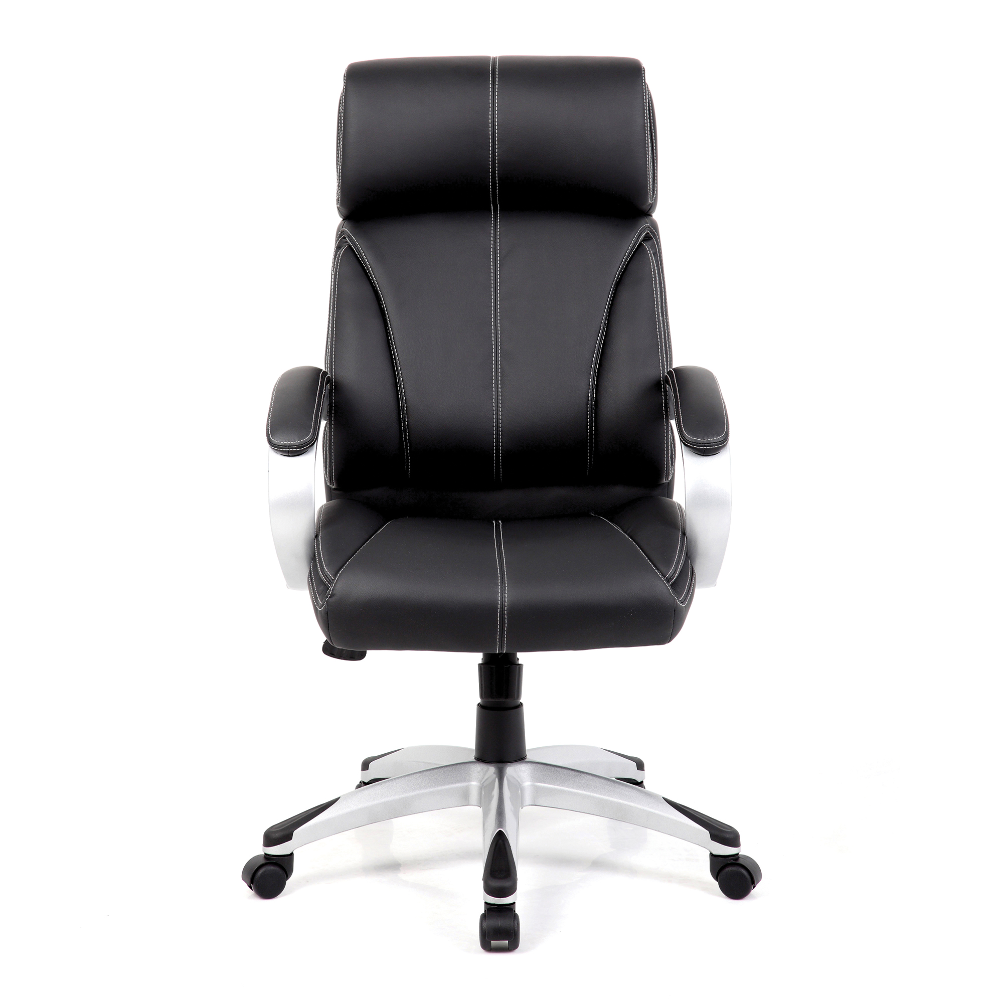 This outstanding high back Manager armchair is bold, beautiful and will make a statement in any area in which you choose to use it. It combines unique style and unrivalled comfort with deep cushioning to an integrated rolled headrest and a generously proportioned seat and posture sculpted backrest. Stylish and intricate contrasting stitching to its plush leather faced upholstery is finished with matching padded and upholstered armrests. A fully reclining tilt mechanism with tension control allows adjustment for the individual’s bodyweight and is lockable in the upright position. A gaslift provides easy seat height adjustment and satin silver finished base with co-ordinated arms complete this unmistakeable design.