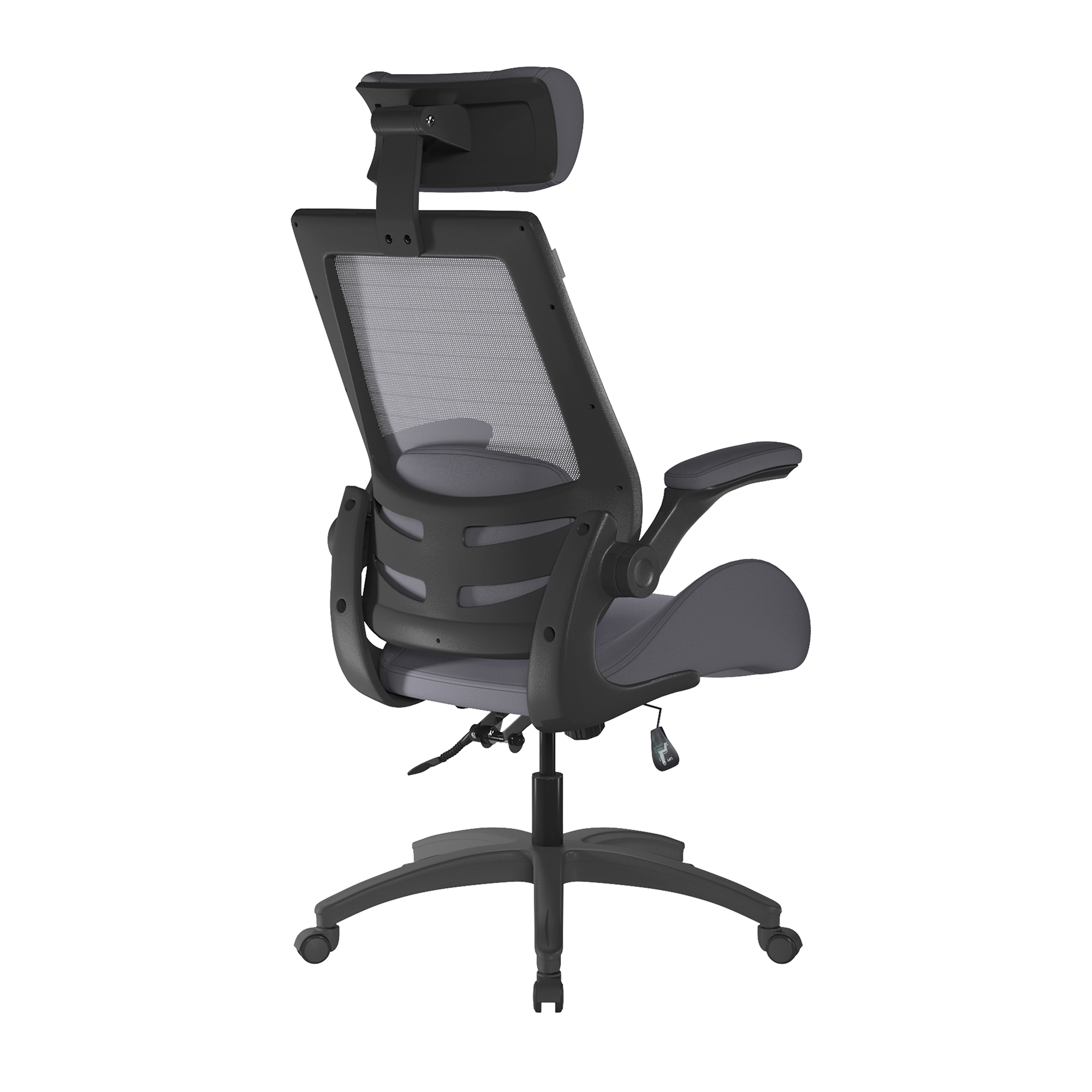 High Back Mesh Chair with High Weight Capacity, Deep Moulded Seat Foam, Folding Arms and Optional Headrest – Grey