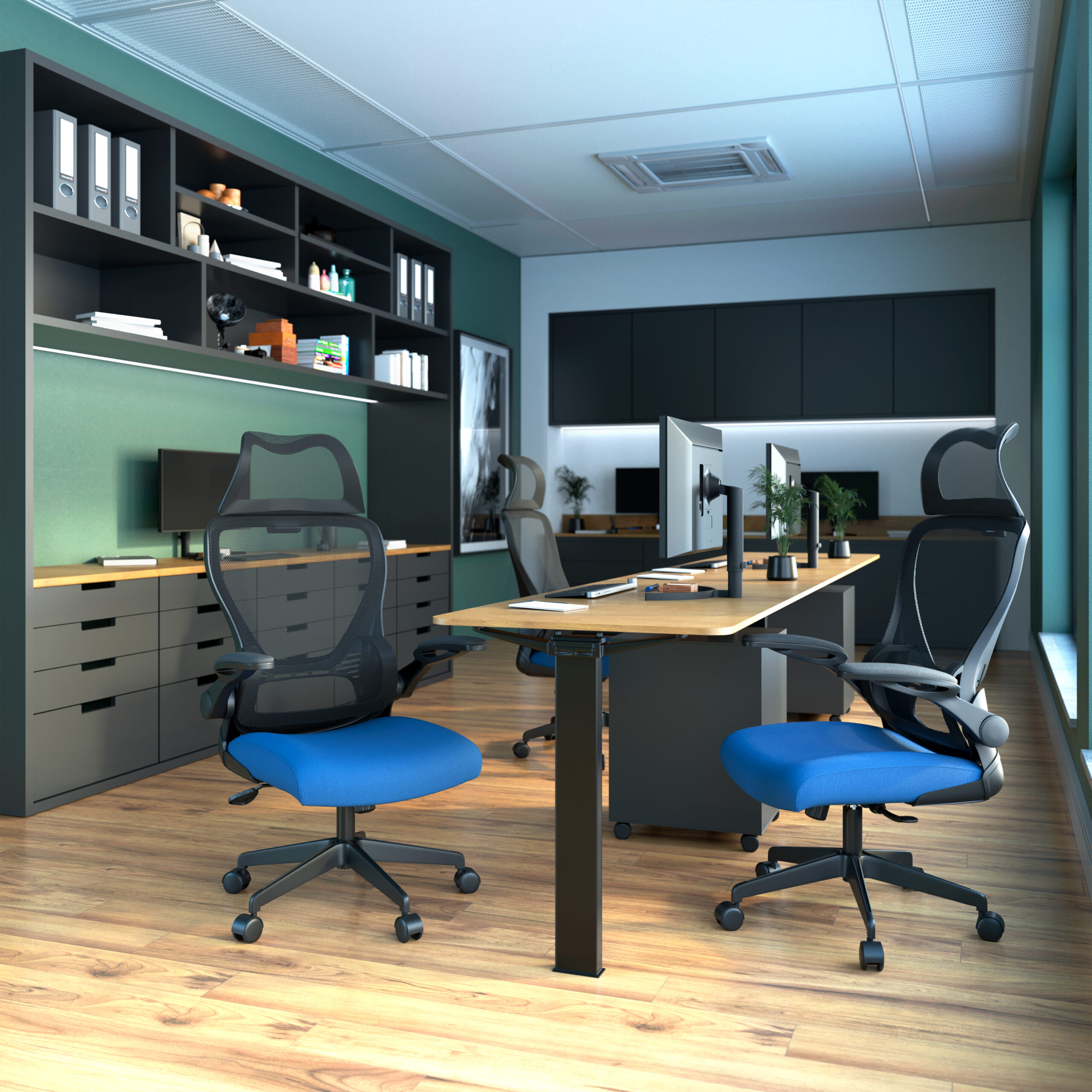 High Back Mesh Chair with Moulded Seat Foam, Folding Arms and Headrest