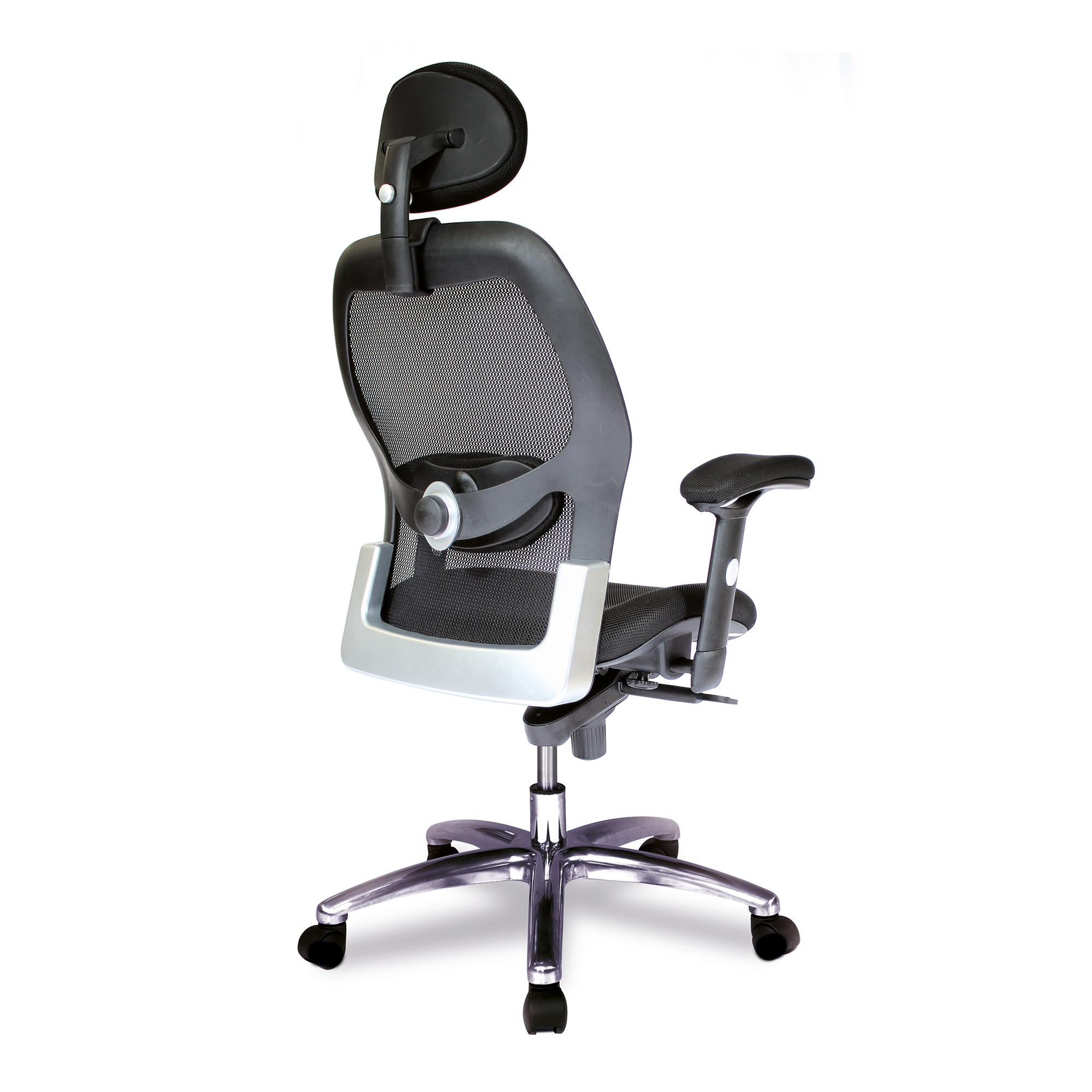 Our high back mesh task operator armchair with adjustable headrest & chrome base offers a generously proportioned posture curved upholstered seat with waterfall front and contoured black nylon detailed mesh backrest with adjustable lumbar support, a synchronous mechanism for simultaneous adjustment of seat and backrest adjustable to suit the user’s bodyweight (tension control) and stylish adjustable T-section padded arms.