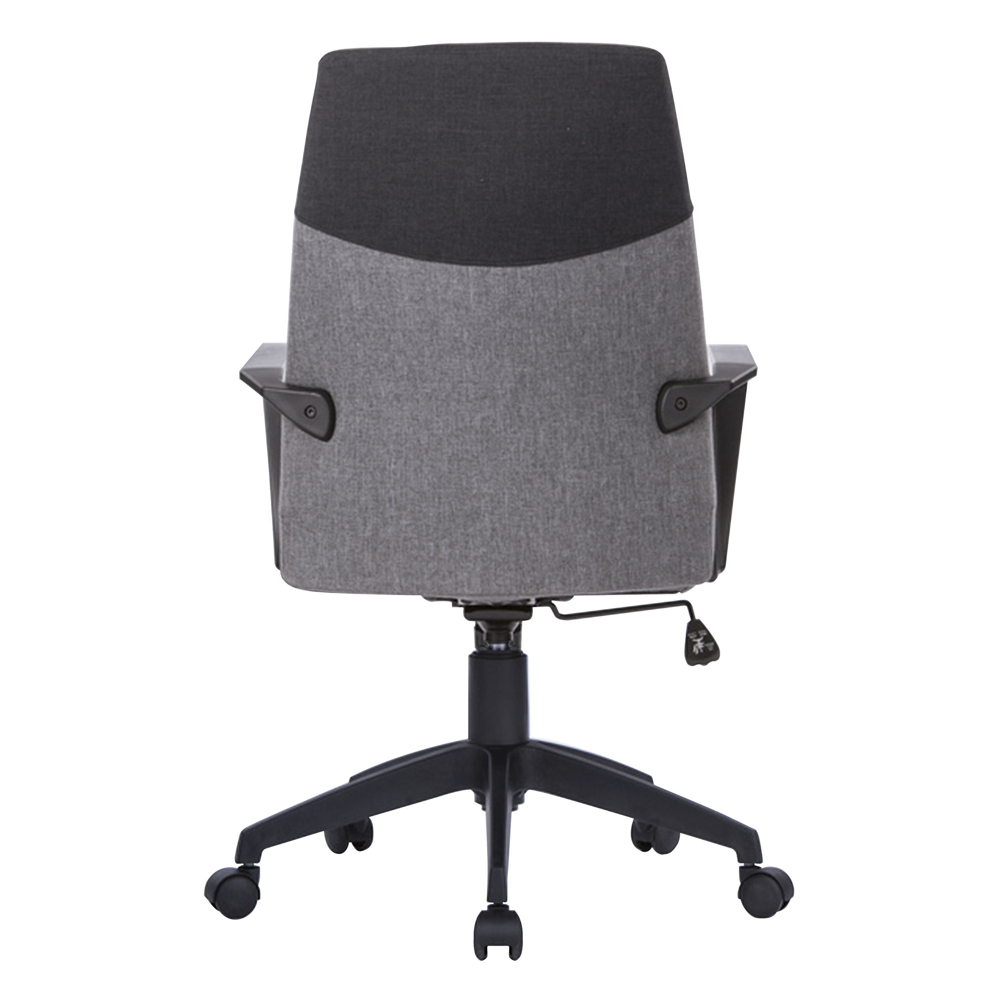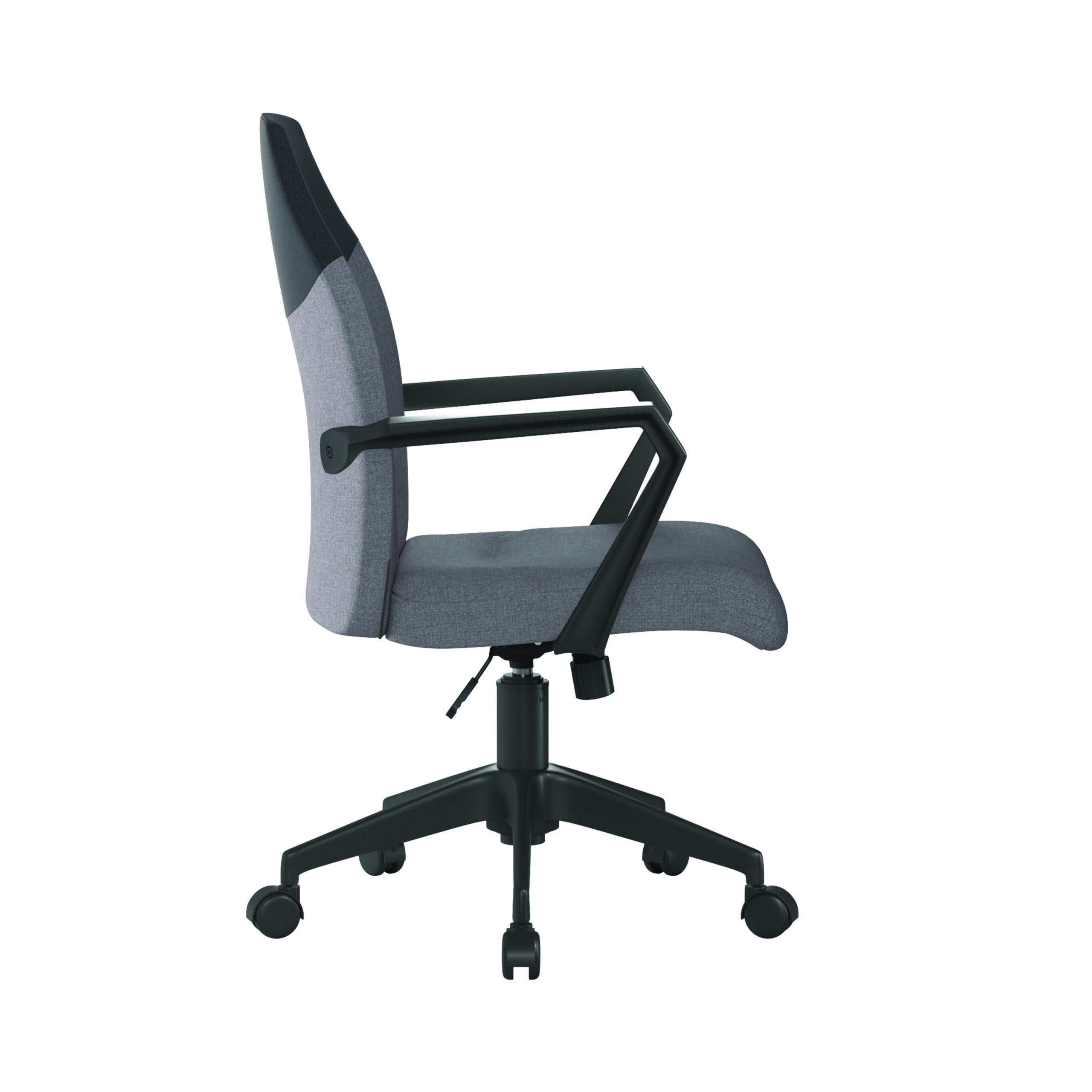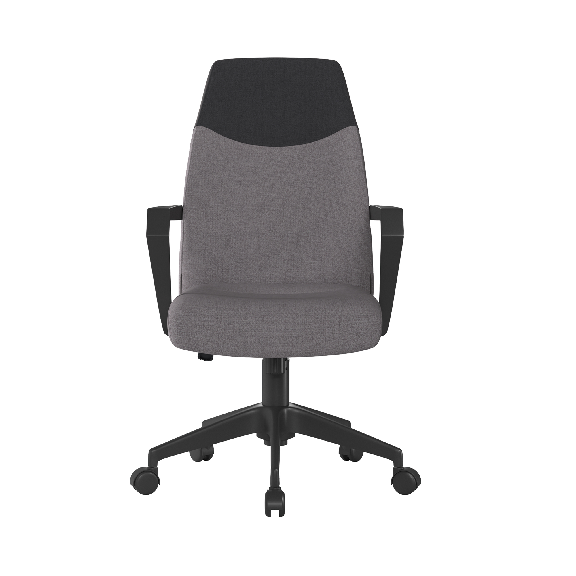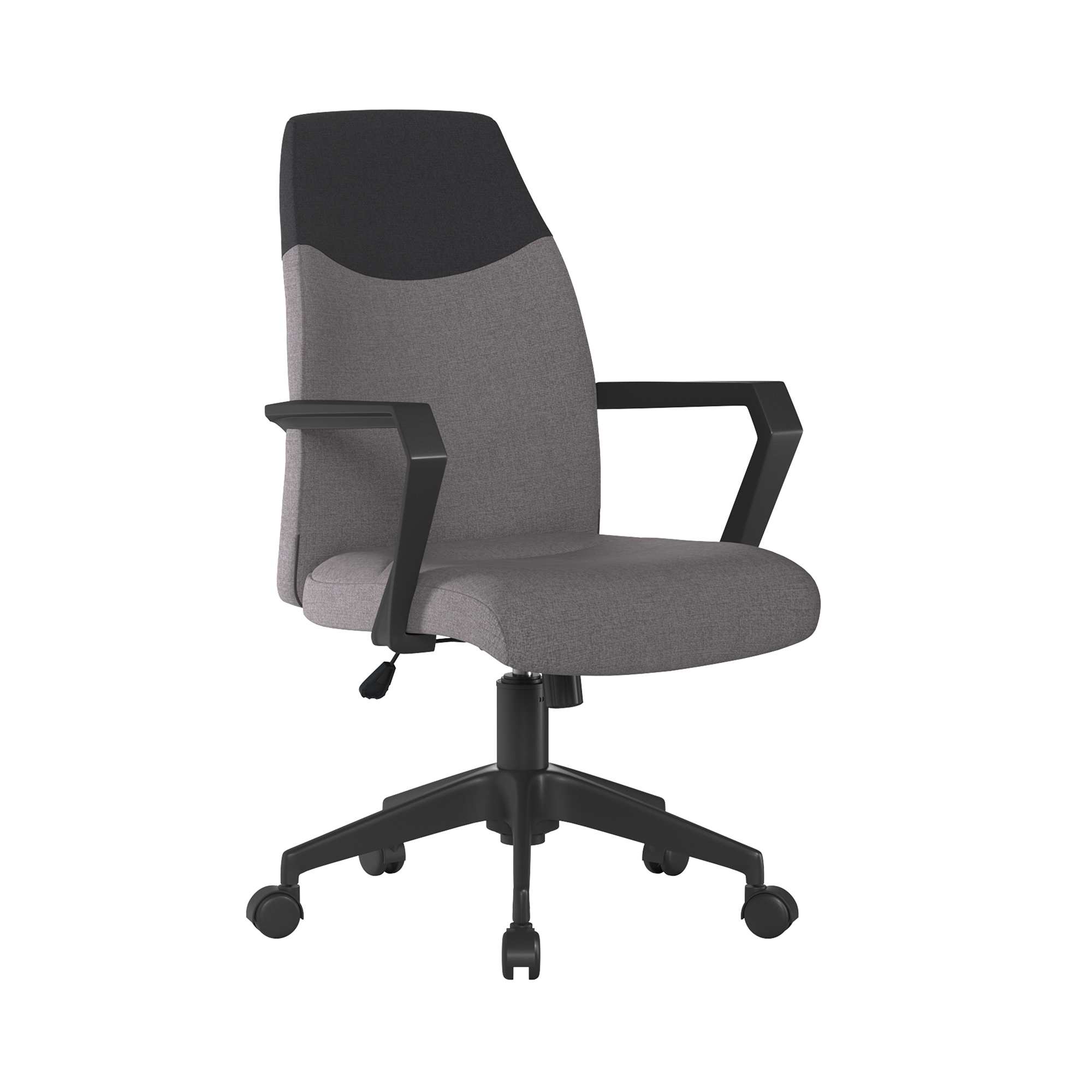 Elevate your workspace with this distinctively modern high back executive chair, where durability, comfort and style converge to enhance your productivity and comfort. This armchair features a durable fabric upholstery with a sleek two-tone back and angular arms that provide the chair with a modern edge, allowing it to combine function and lasting comfort with contemporary design seamlessly. The 360-degree swivel feature, coupled with an adjustable gas lift for seat height adjustment, heavy duty nylon castors and powder-coated nylon black base ensure this chair offers smooth and effortless movement while maintaining stability and reliability. Discover the perfect balance of form and function today.