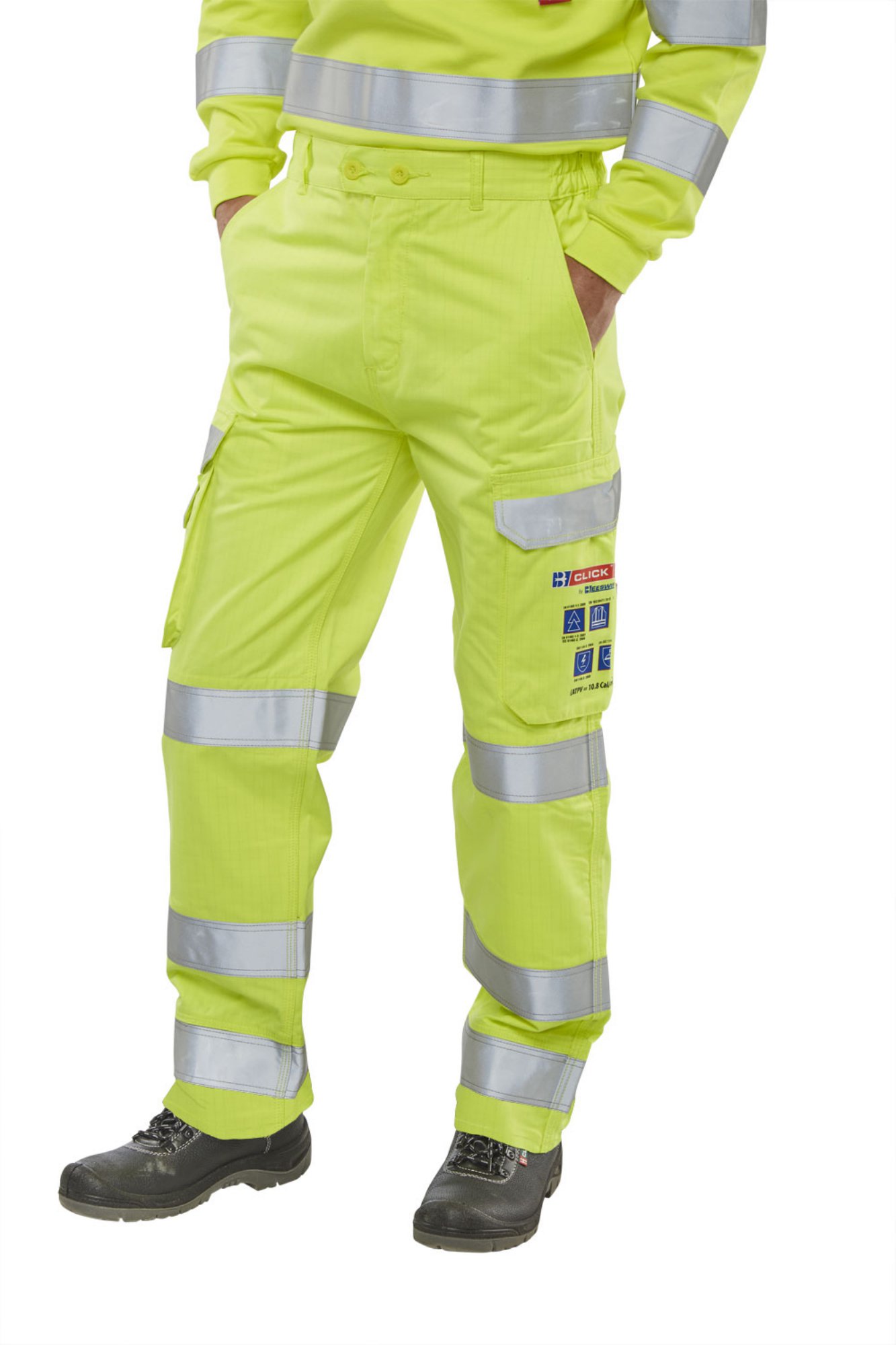 Fire Retardant, Hi Vis, Anti-static, ARC Flash cargo style trousers. 300gsm 60/40 Modacrylic/cotton blend. Triple stitch construction. 7 belt loop part elastic waistband, double button closure. 2 hip pockets. Rear patch pocket with hook and loop closure flap. Large bellows pocket to each leg with hook and loop closure flap. Right leg mobile phone pocket with hook and loop closure flap. All pocket flaps with Retro-reflective tape feature. Internal knee pad pouches. Large qualifying icons on left leg pocket. EN ISO 13688:2013 – General requirements for protective clothing, EN ISO 20471:2013 Class 2 – Test method for high visibility, EN 1149-3:2004 – Anti Static – Test methods for measurements of charge decay, EN 1149-5:2008 – Anti Static – Material performance and design requirements, EN ISO 11611:2015 (Class 1 A1 A2) – Protective clothing for use in welding, EN ISO 11612:2015 (A1 A2 B1 C1) – Protection against heat and flame ARC FLASH IEC 61482-2:2009 – Performance requirements and design requirements EN 61482-1-1:2009 (ATPV = 10.8 Cal/cm2) – Open Arc testing, Each garment style is independently tested to both box and open ARC standards. Click ARC production is covered by article 11B certification.