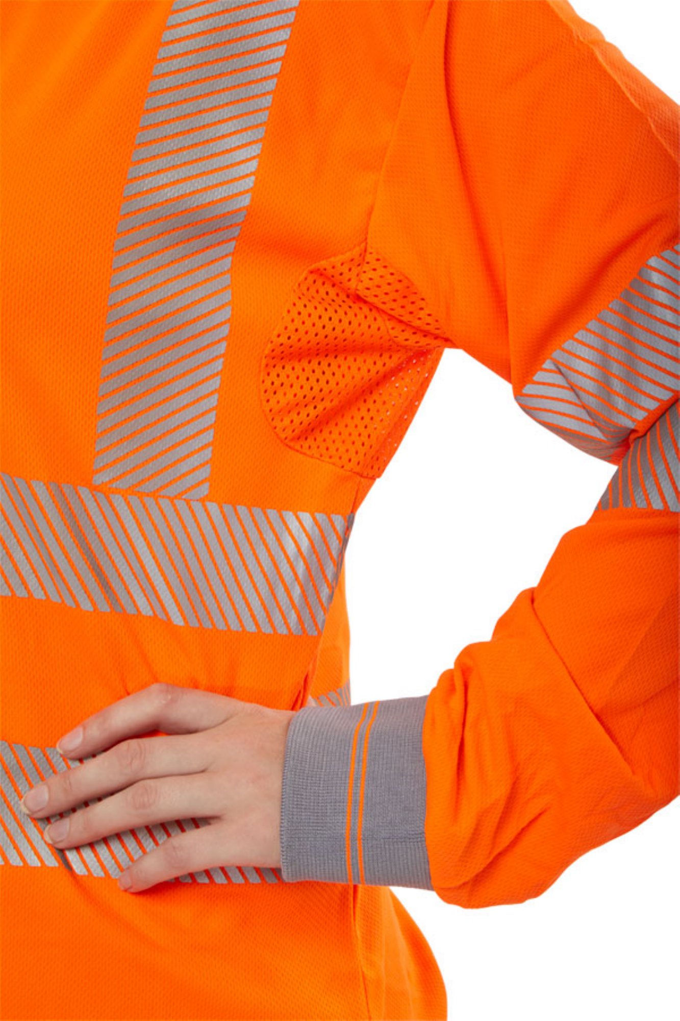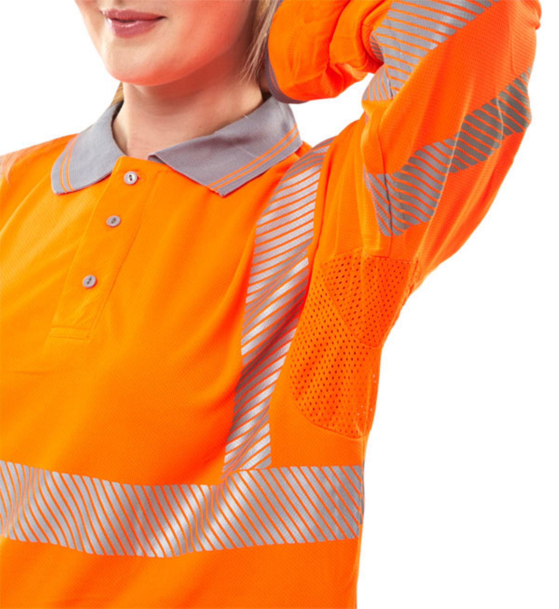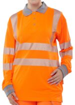 100% polyester ”Bird Eye” fabric. 3 Button placket. Grey trim to collar and cuffs. Mesh underarms. Retro-reflective Dynamic stripe tape, UV Protection, SCOTCHGARD Moisture Management, Anti-Bacterial, Insect Repellent, Conforms to EN ISO20471 Class 3 high visibility, RIS-3279-TOM – Railway use certified. Conforms to EN 13758-2 (40+ UV Protection)
