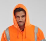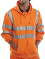 Hooded sweatshirt, 280 gsm fleece fabric, 100% polyester, Anti pill (the fabric has been treated to prevent little balls (or pills) of thread appearing on the surface of the fabric), Full length front zip. Handwarmer pockets. Retro-reflective sew on tape. Two band & brace, Conforms to EN ISO 20471 Class 3 high visibility, RIS-3279-TOM – Railway use certified.