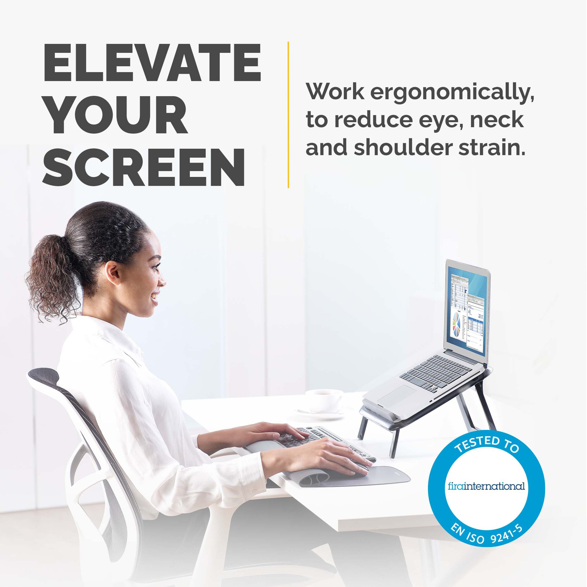 • FIRA ACCREDITED – This laptop stand has been tested by FIRA International Ltd to comply with the ergonomic requirements set out in European Health and Safety Legislation: EN ISO 9241-5