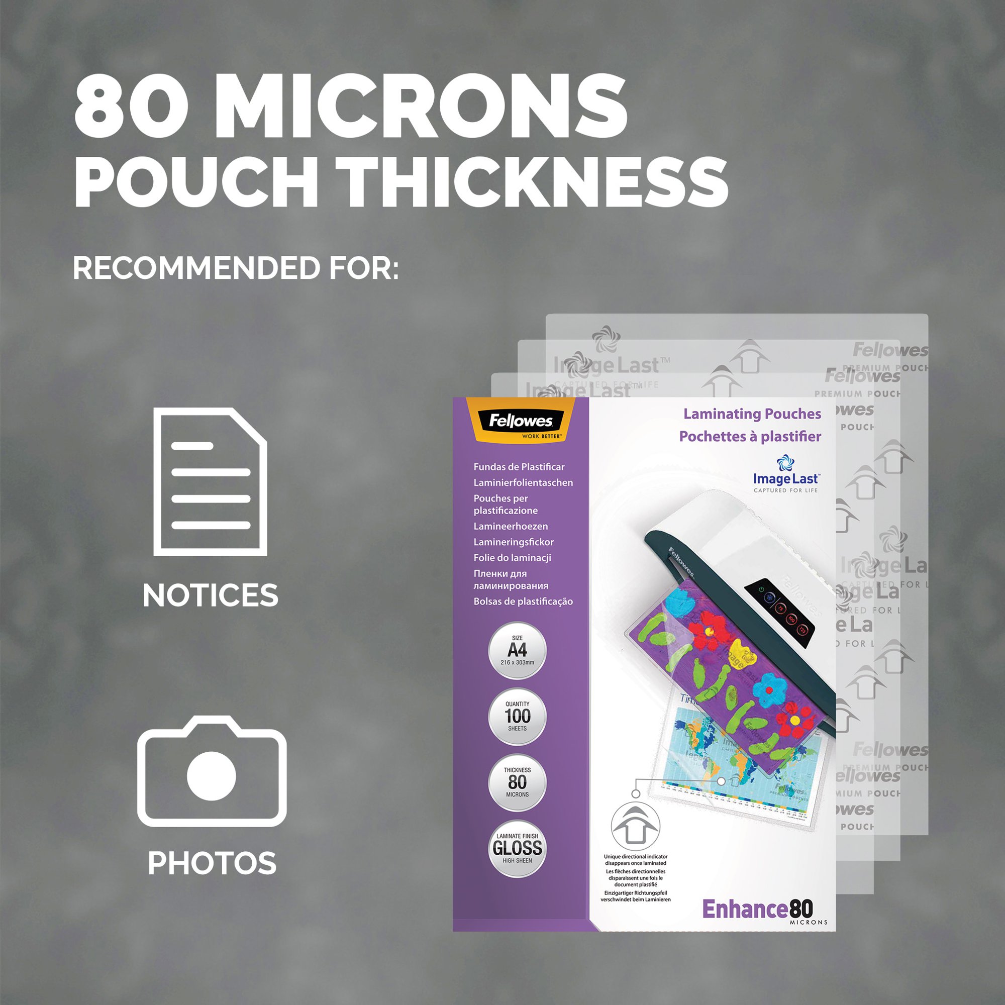 Fellowes SuperQuick™ laminating pouches are sealed on the landscape edge, meaning that laminating can be done up to 40% faster. These gloss finish A4 pouches are available in 80 and 125 Microns for a basic or advanced level of document protection, making them ideal for notices, photos, instructional materials and frequently handled documents. As the seal is on the long edge of the pouch, these are compatible with A3 laminators only. Fellowes laminating pouches ensure 100% Jam Free performance when used with Fellowes laminators.Laminate 40% faster with Fellowes SuperQuick™ 80 Micron laminating pouches – 100 pack