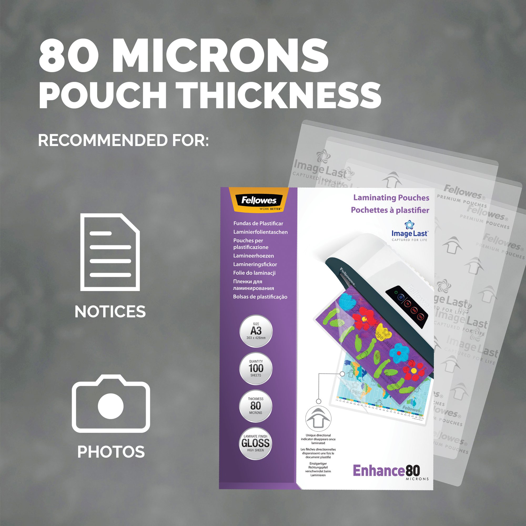 Make your document last with Fellowes premium quality laminating pouches. These gloss finish pouches are available in 80, 100, 125, 175 and 250 Microns for all levels of document protection, making them ideal for notices, photos, instructional materials and frequently handled documents. Available in various standard sizes from A2 to A5. Fellowes laminating pouches ensure 100% Jam Free performance when used with Fellowes laminators.