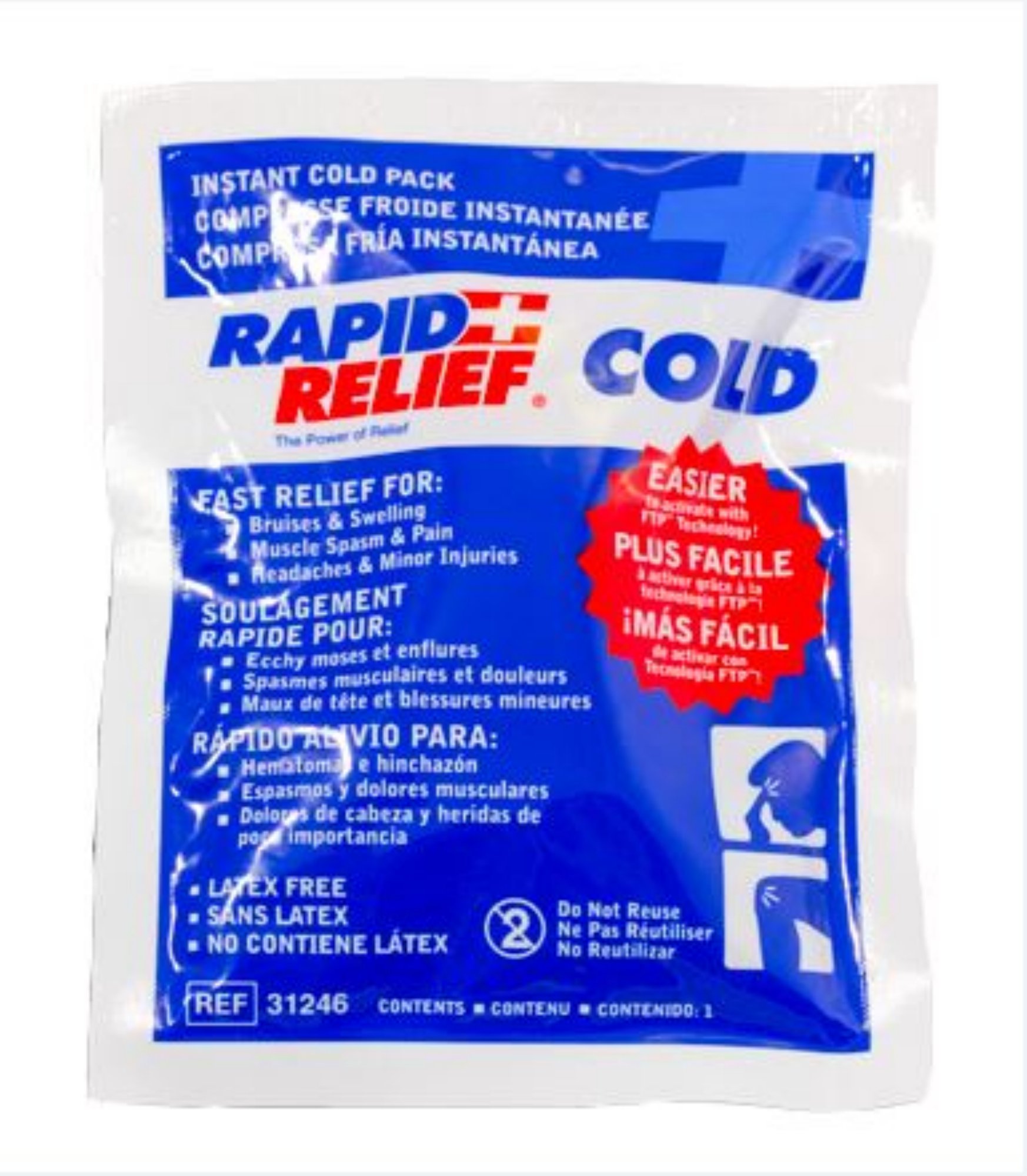When an injury requires immediate cold therapy, Rapid Aid® Instant Cold Packs are your answer. Having the instant cold pack as part of your first aid kit on the sidelines of life allows you to treat an injury on the spot without having to search for ice in an emergency. They activate instantly and provide up to 20 minutes of cold therapy, helping to begin the healing process faster. Features, Temperature: Delivers approximately 1ºC / 34ºF of cold therapy when activated at room temperature, FTP (fold-to-pop) technology, allowing the user to activate the cold pack simply by folding it in half, Tri-lingual packaging (English, Spanish and French) Application ”INSTANT COLD THERAPY RELIEF:, Bruises and swelling, Muscle spasms and pain, Headaches and minor injuries