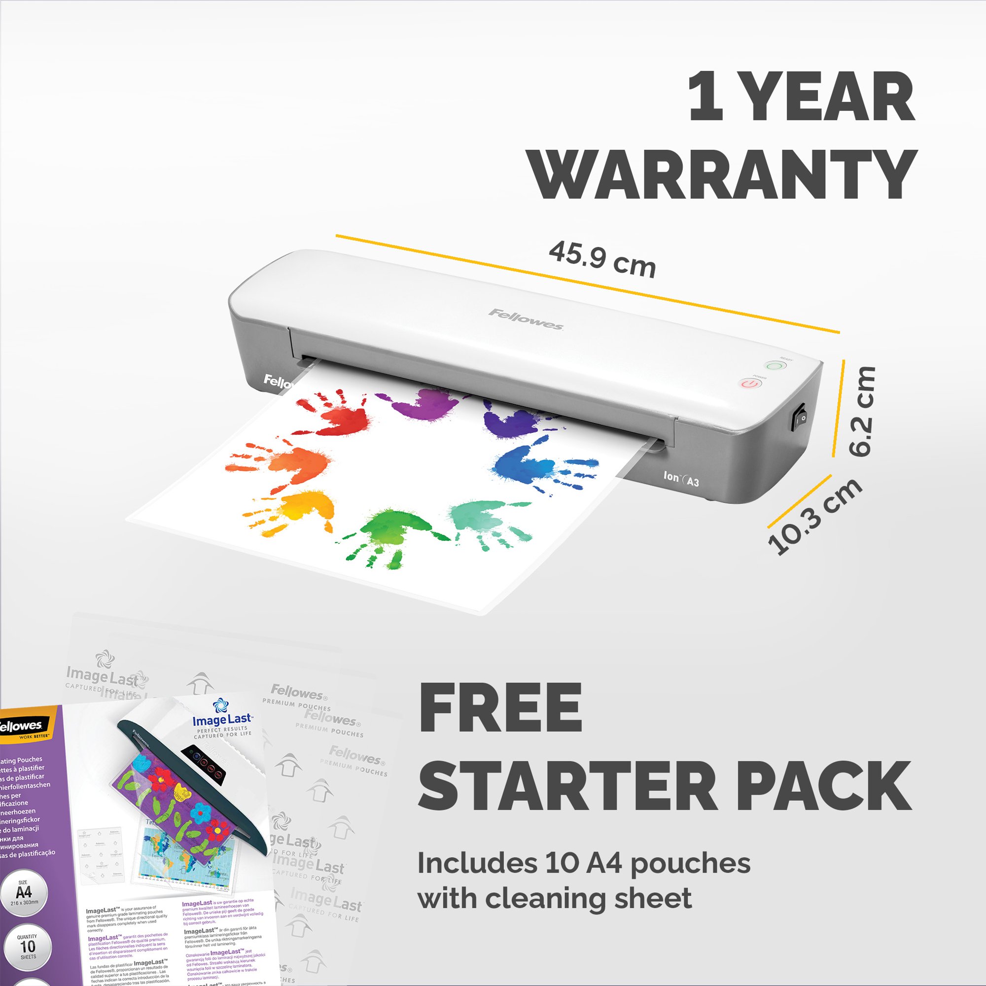 • STARTER PACK INCLUDED – Your Fellowes A3 laminator includes a 10-document starter pack with samples of Fellowes laminating pouches that give a suitable finish to your laminated work
