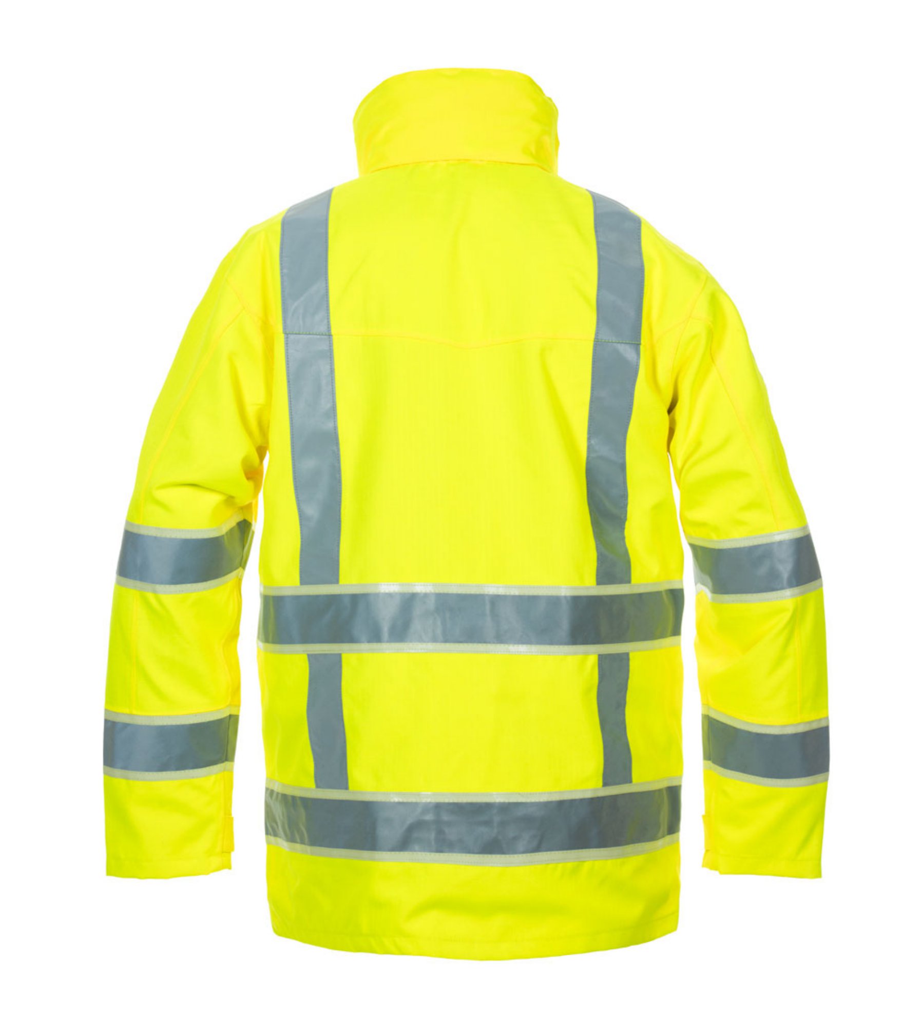 Concealed zip front with double storm flap cover and press stud closure, Hood in collar with draw cords, Hood with innovative fixture for improved hearing through hood, 2 chest pockets with flap, Fixed ID pocket on a band, Napoleon pocket, Inner pocket, 2 front pockets with flap, Adjustable cuffs using hook and loop fastening, Used in combination with the Weert, quilted lining HYD040350, Glow in the Dark (GID) tape for improved visibility in low lighting environments, GID tape is an enhancement to the garment and not an intrinsic part of EN ISO 20471, Approximately 8 hours of glow once charged for 5-10 minutes dependent on light source, No batteries required, 220 gsm PU coated Ripstop Polyester, Conforms to EN ISO 20471:2013 Class 3 High Visibility, Conforms to EN343:2003+A1:2007 Class 3:3, Conforms to EN ISO 13688:2013 General requirements for protective clothing