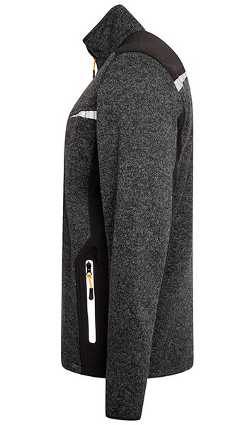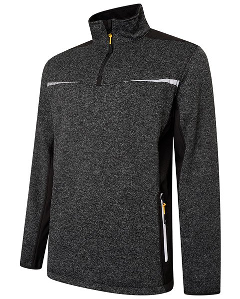 Knitted style quarter zip jumper fleece with two zipped side access pockets. Elasticated taped cuffs and drawcord around bottom hem for comfort during the whole working day. Reflective detail on chest, shoulders and around side pockets. Softshell side panels and under arms for ease of movement whilst working and funnel style neck for extra warmth. Wear it as an outer layer in mild temperatures.