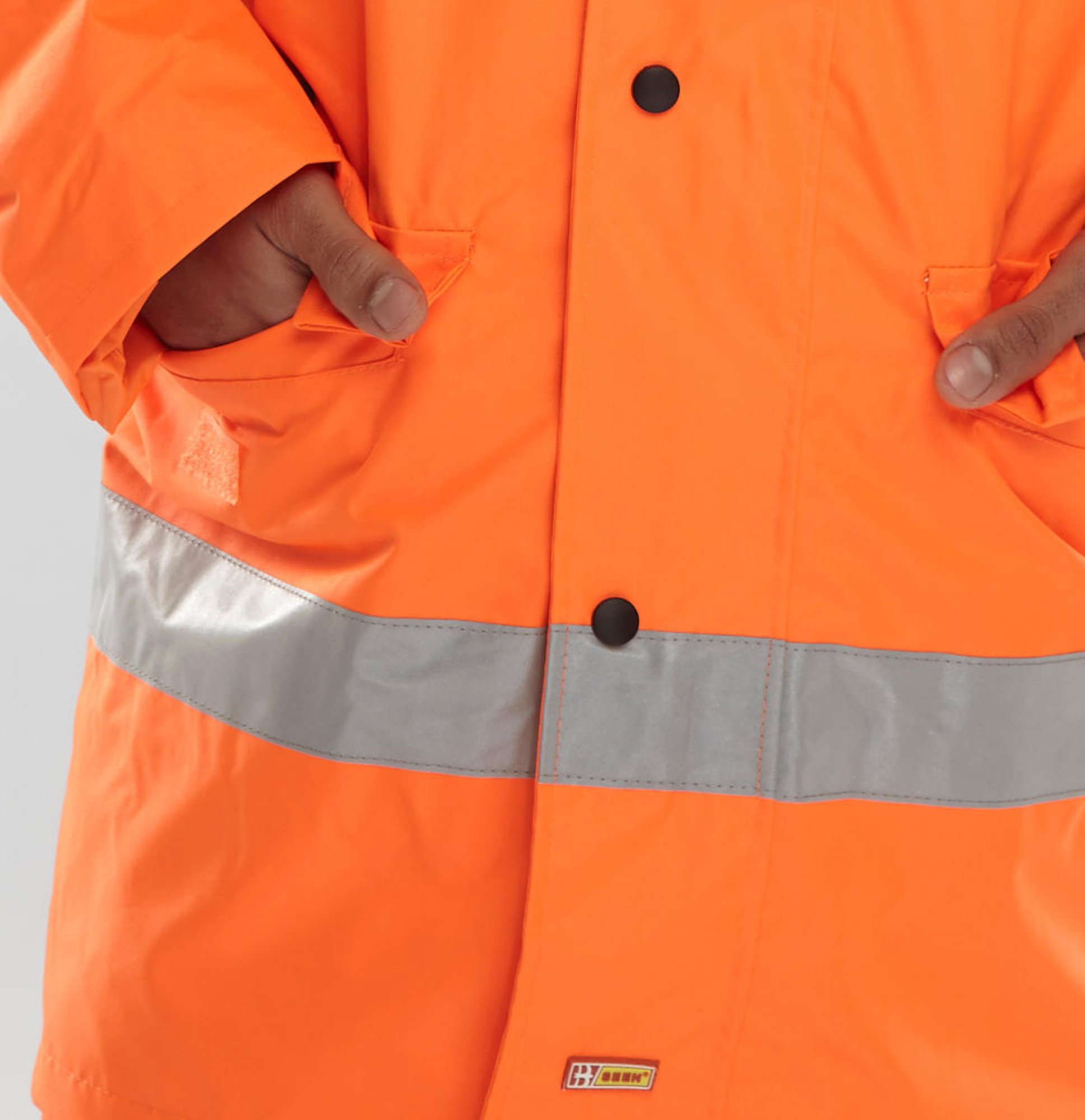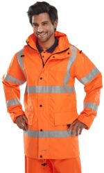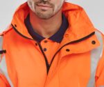 Detachable hood with drawcord. Two-way heavy duty zip front with storm flap. Two lower front patch pockets with hook and loop fastening flap. ID card ‘D’ ring. Drawcord at hip. Internal mesh lining with mobile phone pocket. Two roomy ‘Poachers’ pockets at lower front. Deep Left breast zipped security pocket under front flap. , Knitted storm cuffs. Internal wicking strip. Fully taped seams. Retro-Reflective tape. EN ISO 20471 Class 3 high visibility , EN 343 Class 3 Water Penetration Class 3 Air Permeability, RIS-3279-TOM – Railway use certified.