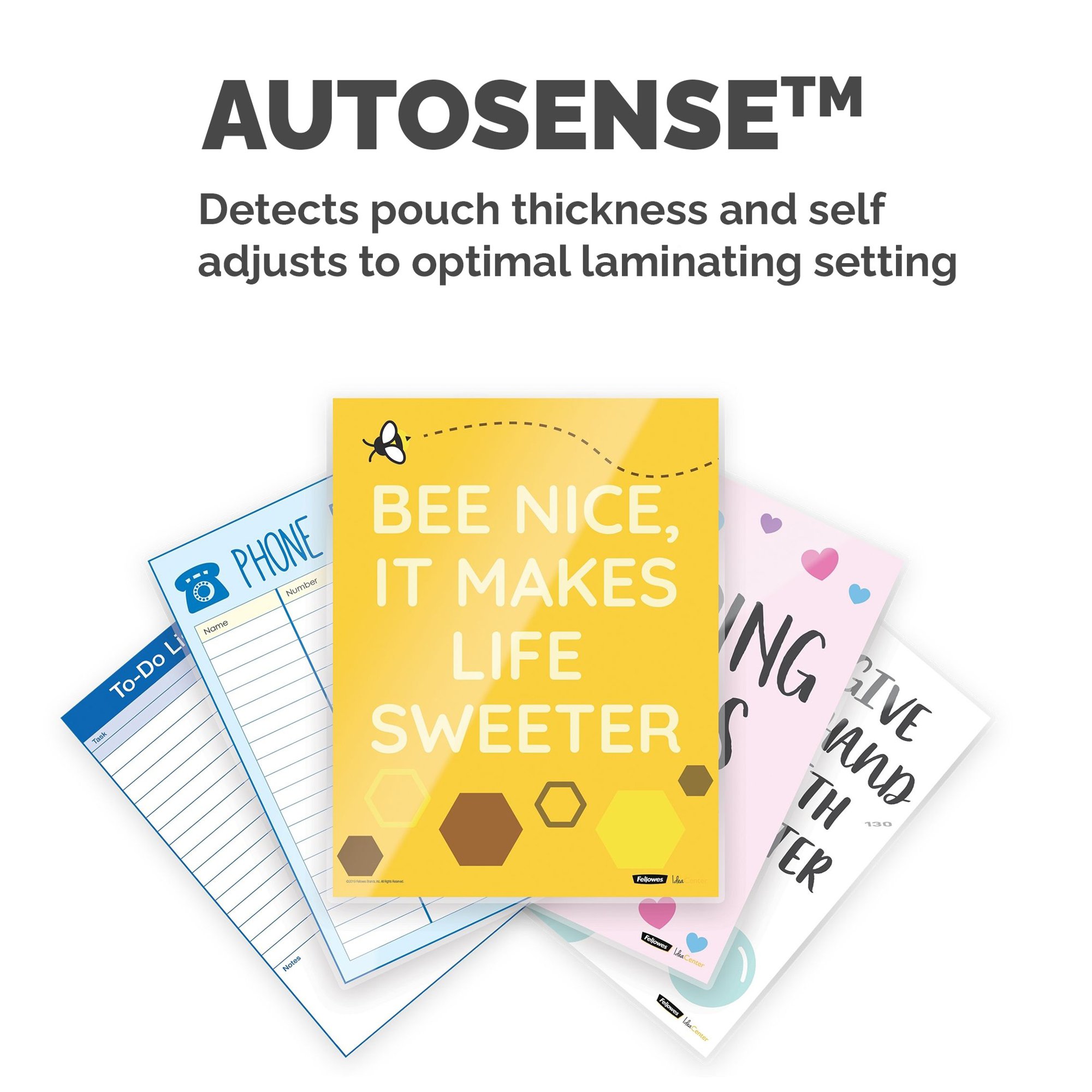 • AUTOSENSE TECHNOLOGY – AutoSense can detect the thickness of a pouch and self-adjusts to the optimal laminating setting for ultimate ease of use