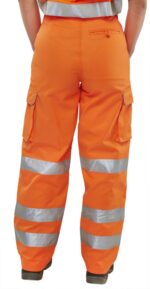 280gsm 80-20 Polyester cotton. Teflon coated for improved soil release. 7 Belt loop waistband. Limited inside leg length. Cargo pockets. Knee pad pocket. Durable hard wearing whilst remaining soft and comfortable. 3 x 3M Scotchlite – retroreflective leg bands. EN ISO 20471 2013: Class 2. GO/RT 3279. Issue 8 2013.