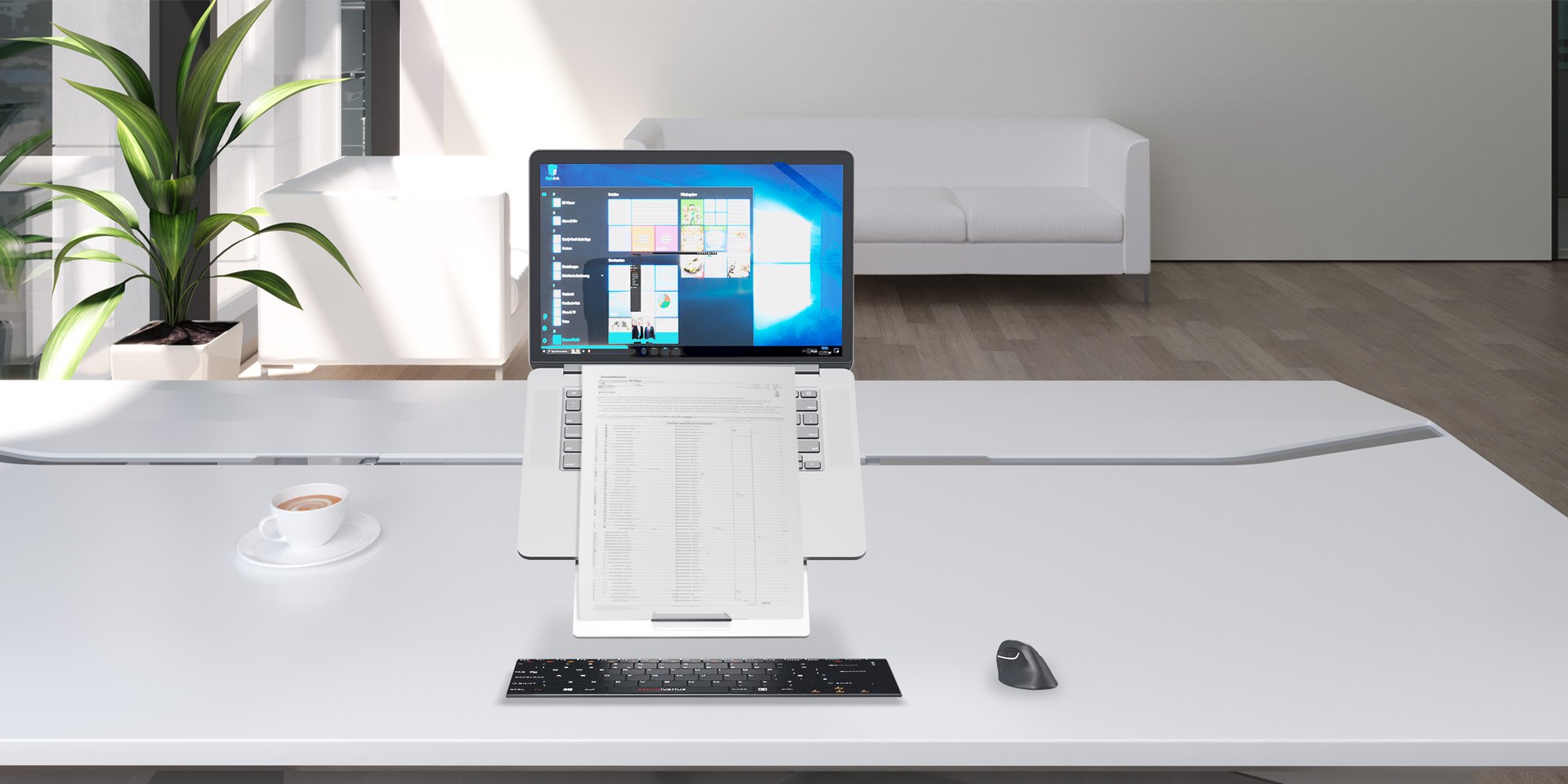 Ergonomic laptop stand with retractable in-line document holder for business comfort and pain-free work.
