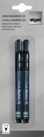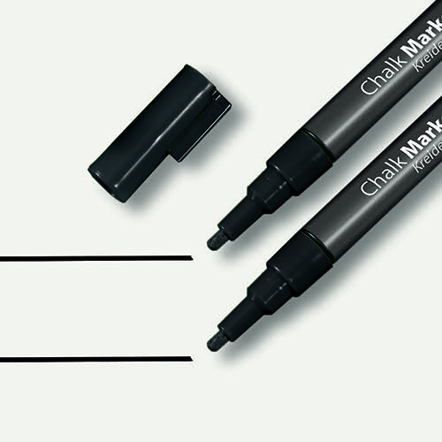 The black chalk marker with the 1-2 mm rounded tip writes with an opaque liquid chalk and are suitable for use on smooth glass and almost all sealed surfaces. The water-based chalk can be wiped off with a damp or dry cloth.
