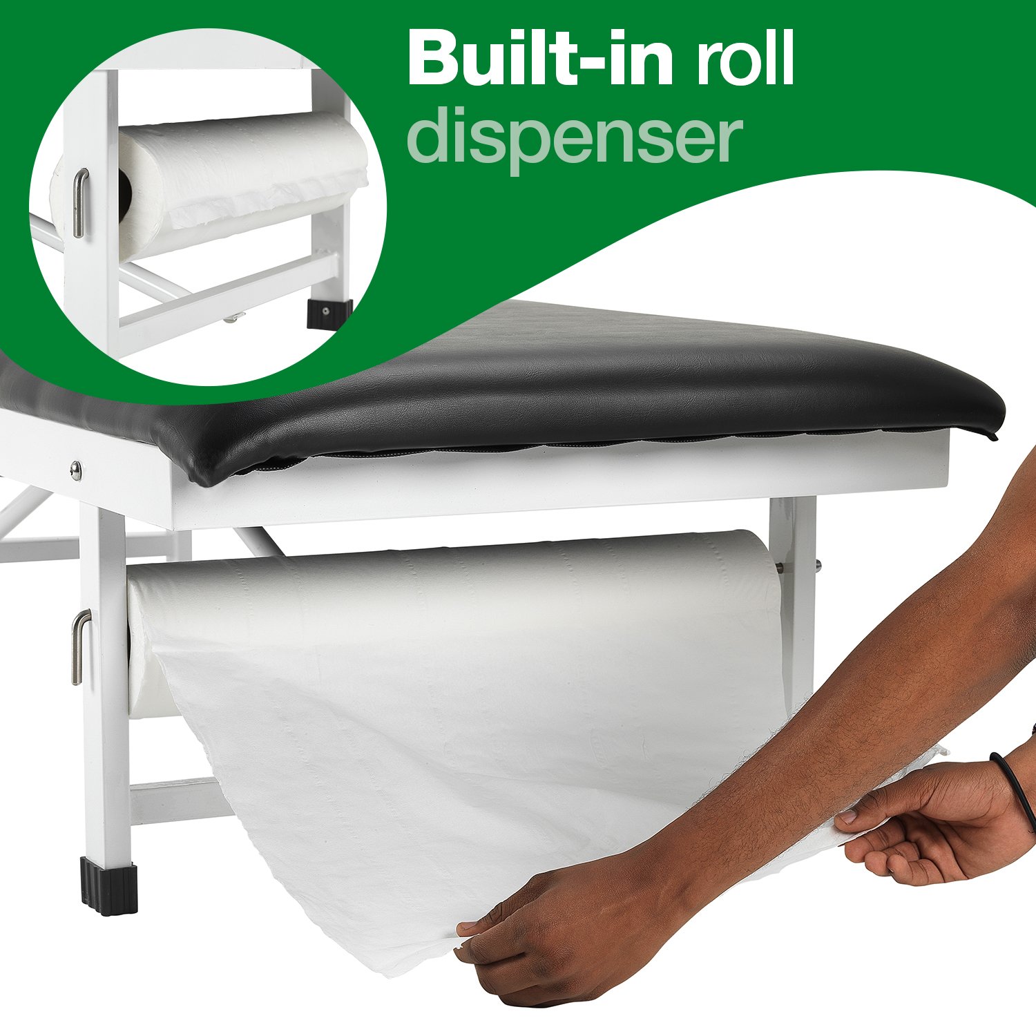 Hygienic and easy to clean – the vinyl surface is easy to wipe clean and the built-in paper roll holder allows for quick, clean surface changes between patients.