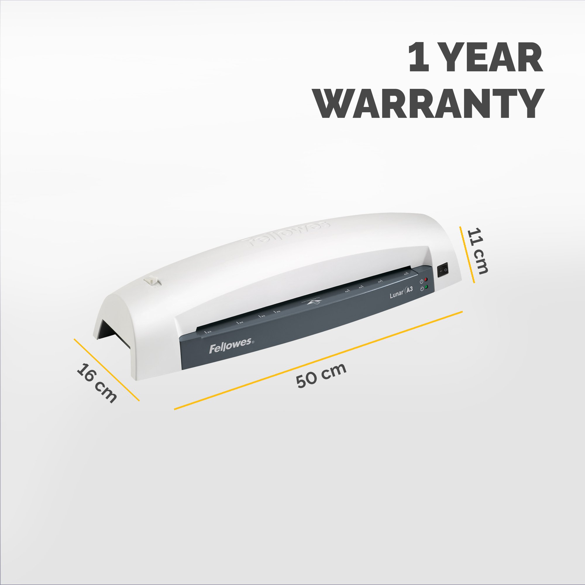 Get creative with the Fellowes Lunar A3 home laminator. This easy to use A3 laminator is perfect for all your personal or family hobby and craft projects, but when it comes to laminating the possibilities are truly endless! Discover how laminating can make the colours come alive on photos or preserve your children’s precious artwork for years to come. The Lunar A3 has been designed for occasional home use and offers 100% Jam Free performance when used with Fellowes branded pouches for that perfect finish in your own home. The release trigger makes it easy to retrieve and realign mis-fed pouches and the double pouch setting (80 & 125 microns) as well as visual (LED light) indicators ensure easy to understand, simple laminating. Suitable for use with Fellowes Enhance 80 & Capture 125 micron pouches. Comes with a 1 year warranty.