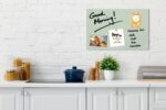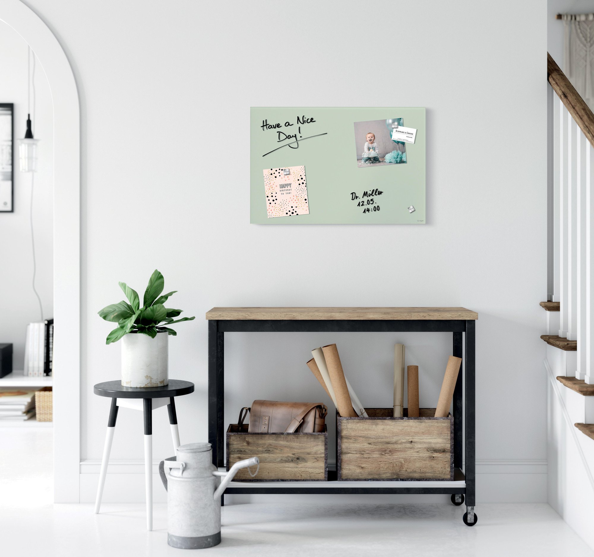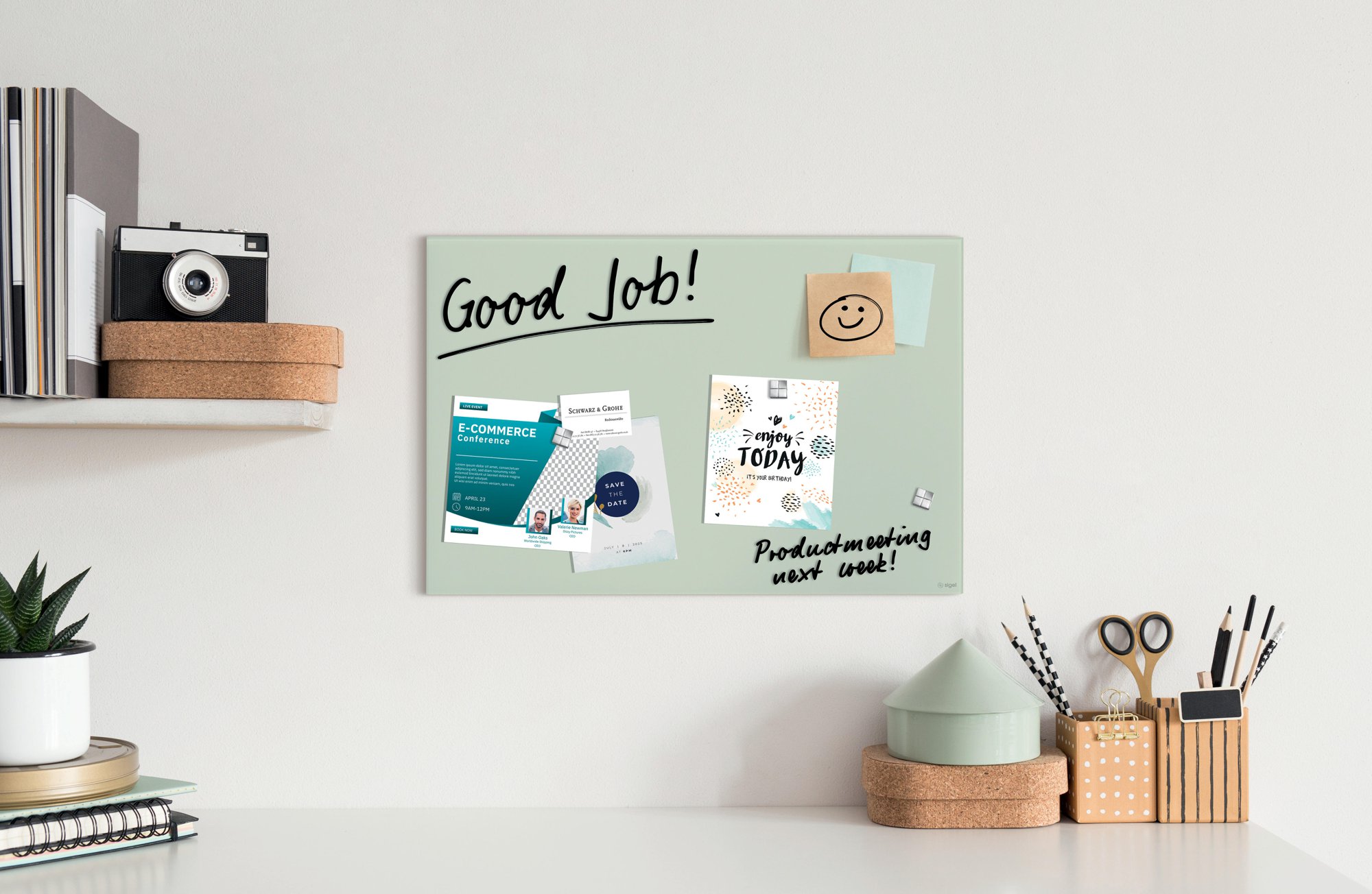 The multifunctional Artverum magnetic glass board is ideal as a contemporary alternative to a pinboard for visualising your ideas in your home office, or for clearly displaying your to-do list. Thanks to the matt surface, there is minimal glare or reflection when photographing the magnetic glass board in the 60 x 40 cm format in mint green. This magnetic board from the international award-winning Artverum range is simply mount in portrait or landscape format with the enclosed mounting materials and can be combined with other boards with the same wall clearance of 10 mm.