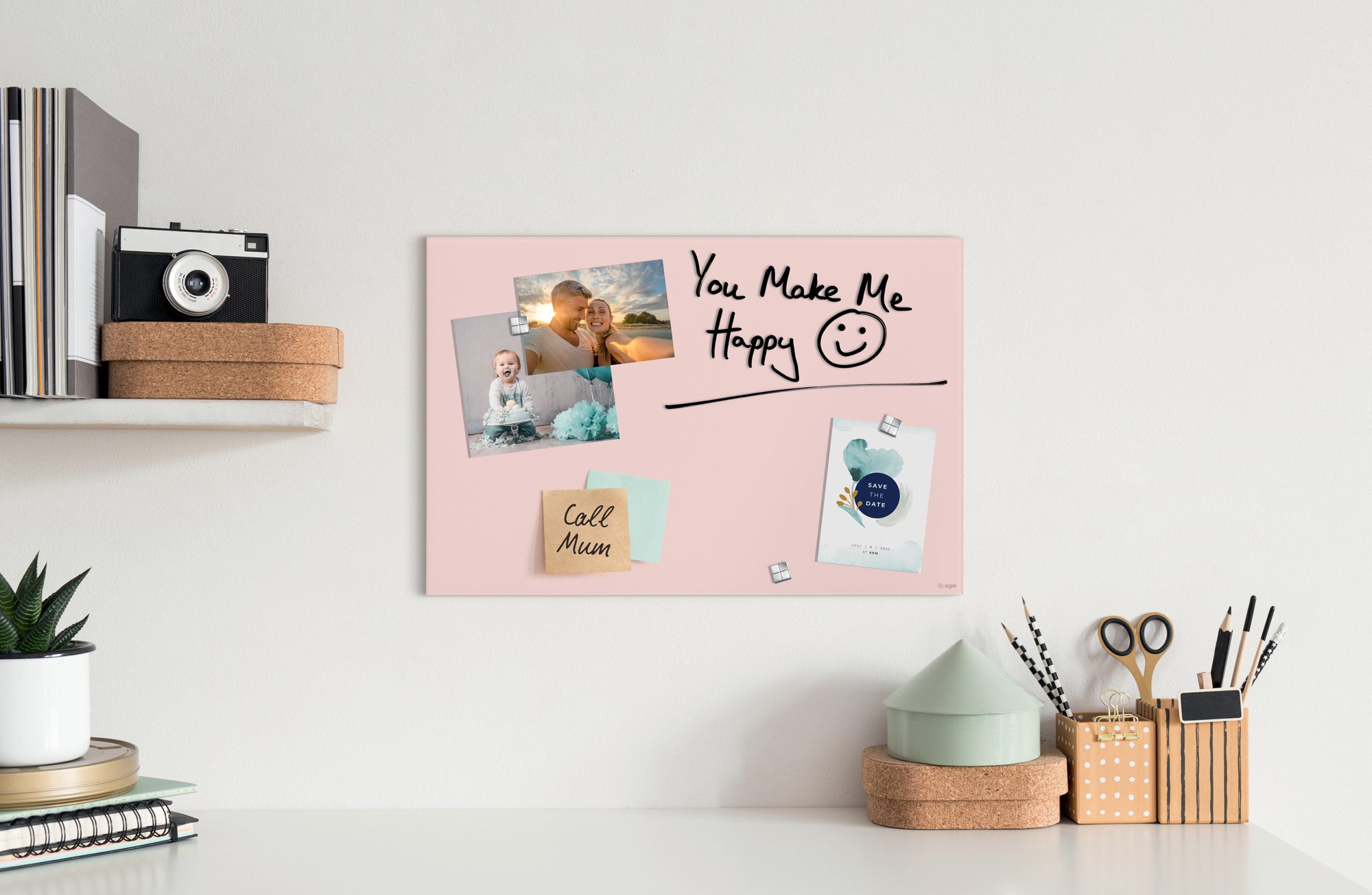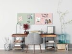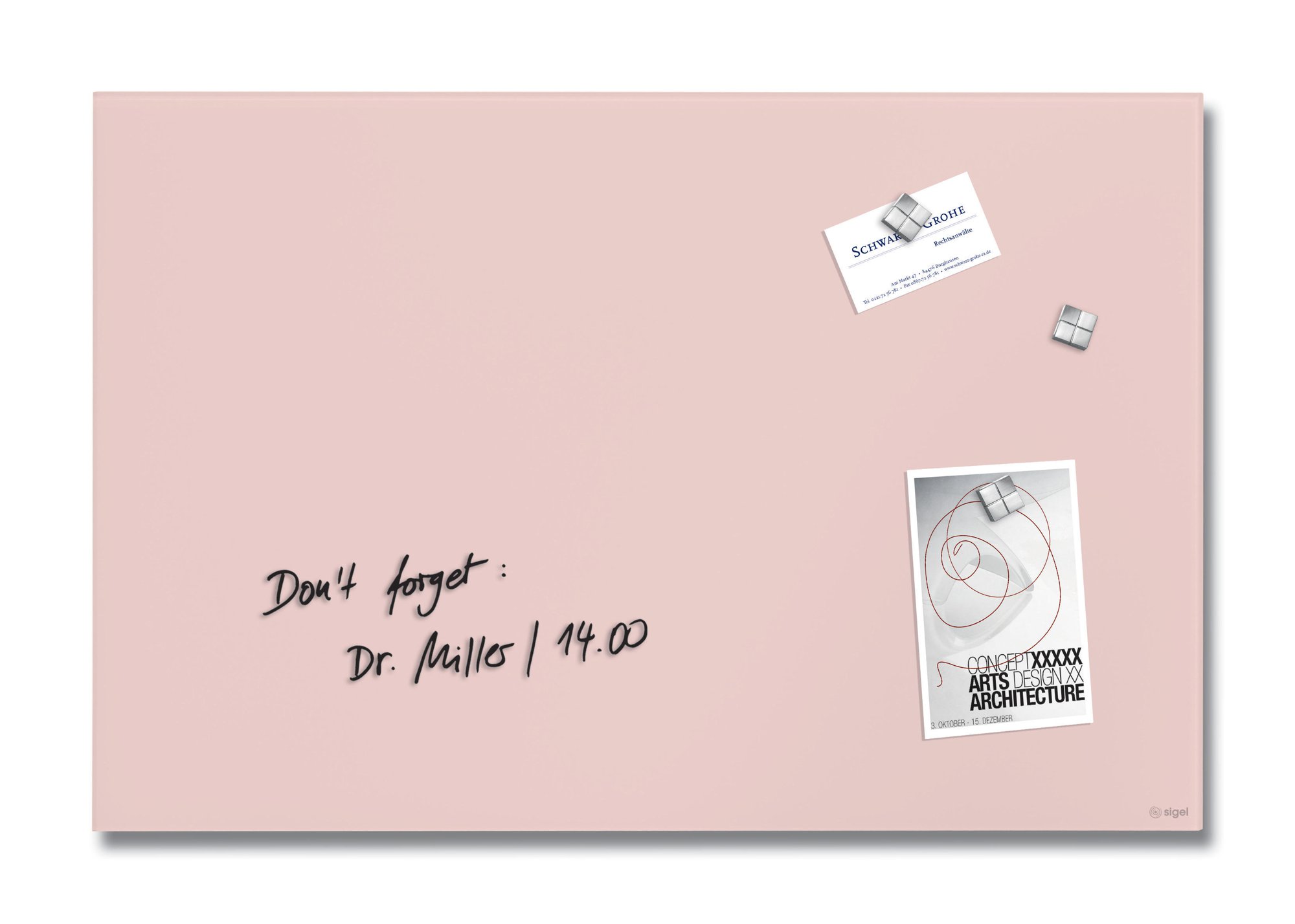 The multifunctional Artverum magnetic glass board is ideal as a contemporary alternative to a pinboard for visualising your ideas in your home office, or for clearly displaying your to-do list. Thanks to the matt surface, there is minimal glare or reflection when photographing the magnetic glass board in the 60 x 40 cm format in rose. This magnetic board from the international award-winning Artverum range is simply mount in portrait or landscape format with the enclosed mounting materials and can be combined with other boards with the same wall clearance of 10 mm.