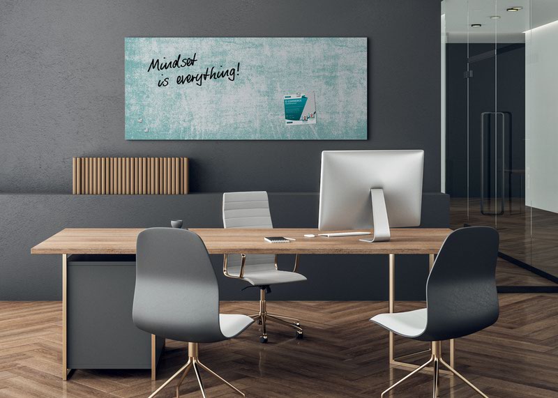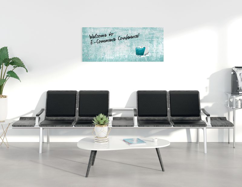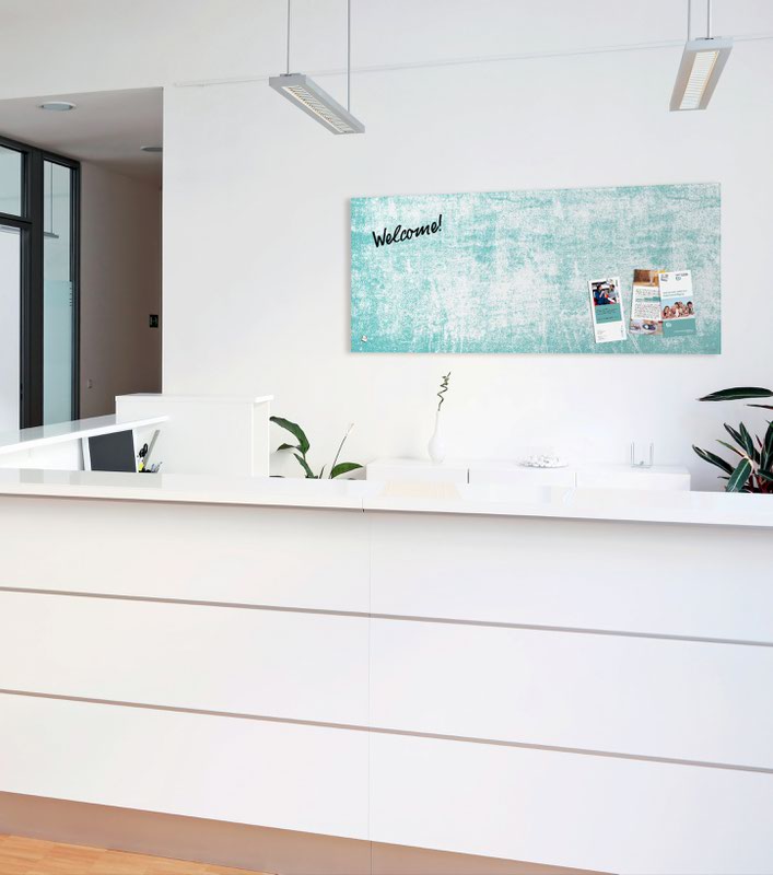 The Artverum magnetic glass board with its writable surface is the modern alternative to a pinboard. This designer magnetic glass board adds a special decorative touch to any room. The matt magnetic glass board in the 130 x 55 cm format, Turquoise Wall design in turquoise, white is bound to impress due to its colour brilliance and absolute sharpness of detail. The matt surface minimises glare and there is practically no reflection from any angle, even in difficult lighting conditions.