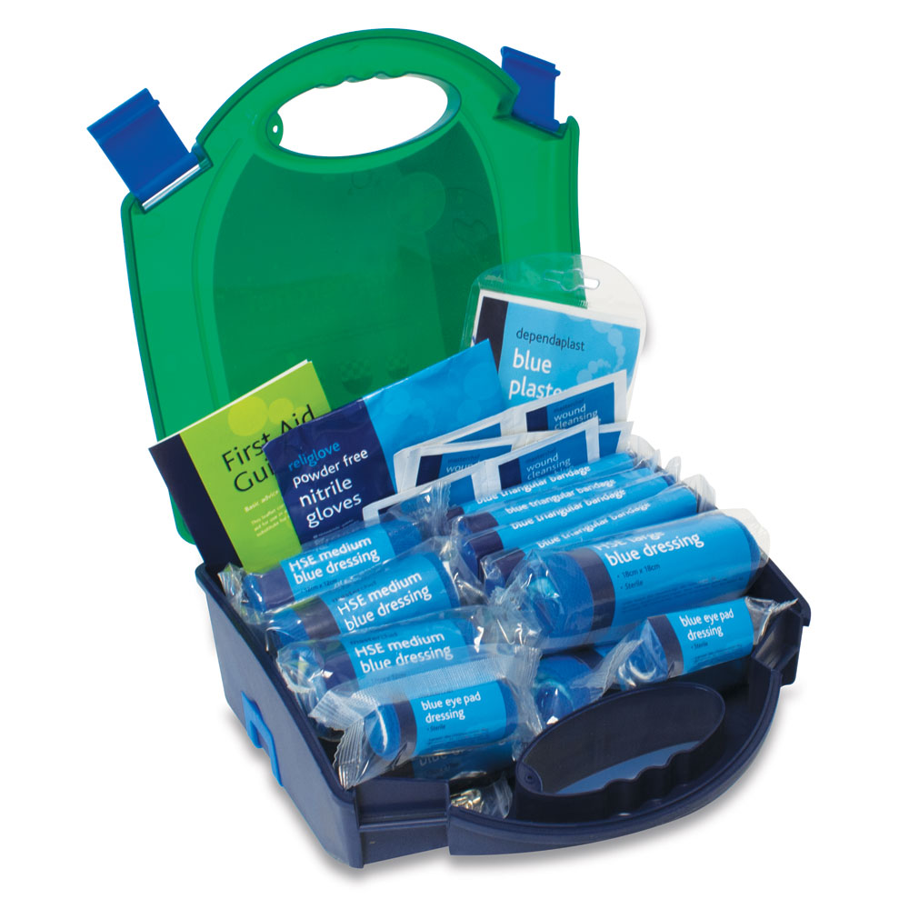 HSE basic food hygiene kit. Unique all blue contents. Content based on 1997 ACOP. Covers 10 persons (risk dependent). Updated designer carry case. 4 Bandages, Triangular, 2 Dressings, Eye Pad, 2 Dressings, HSE Large 18cm x 18cm, 6 Dressings, HSE Medium 12cm x 12cm, 1 Gloves, Pairs, 1 Guidance Leaflet, 20 Plasters, Blue Assorted, 8 Safety Pins, 6 Wipes, Cleansing