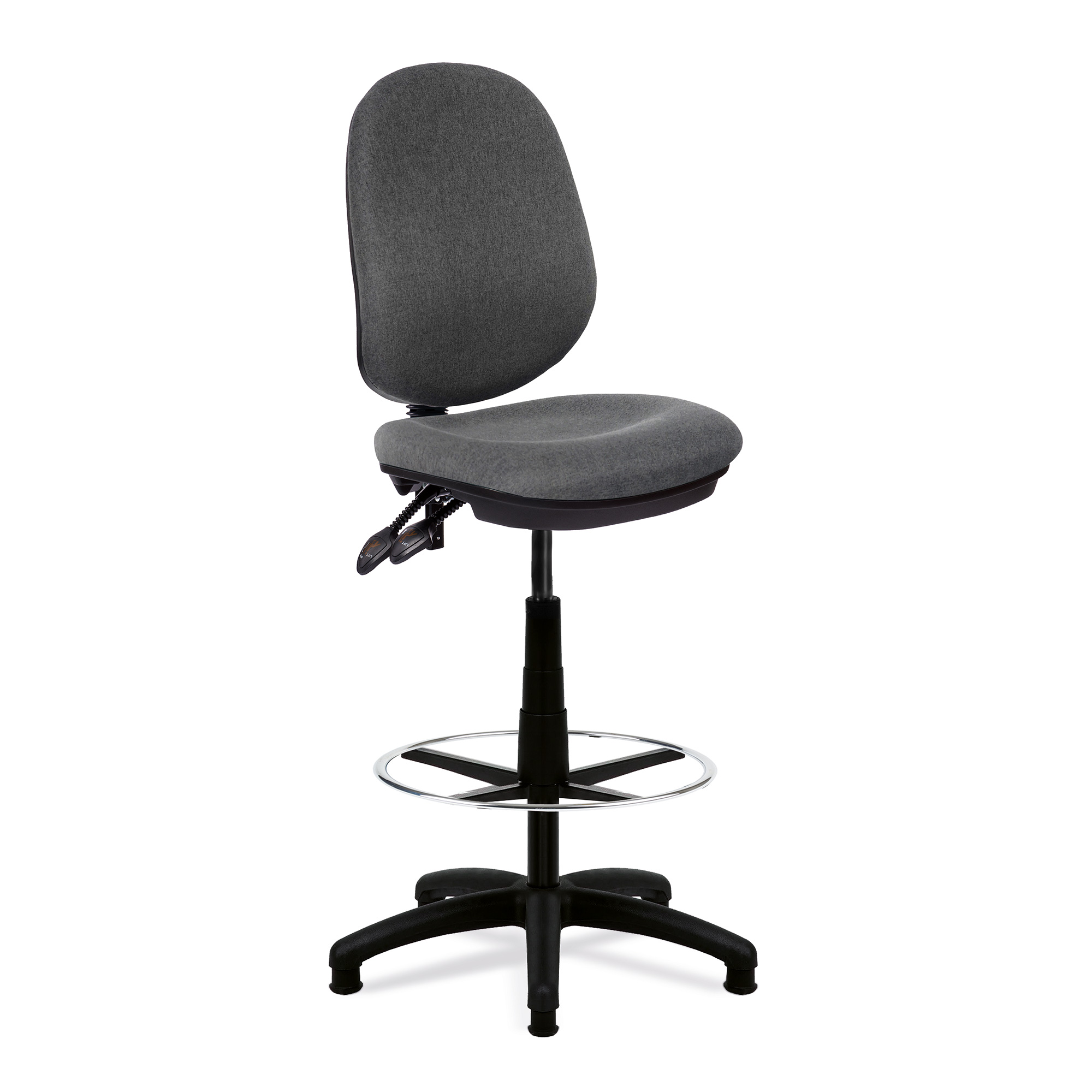 Our trusty twin lever draughtsman chair features a posture curved seat with waterfall front and is fitted with an under-seat skirt. The backrest is contoured and sculpted with integrated lumbar support. The chair is certified to BS EN 1335 Level 3, and a robust gaslift provides easy seat height adjustment. It also offers easy back height, back rake and back tilt adjustment and is finished with a black 5 star base with glides as standard. The chrome foot-ring is height adjustable and can be set at any point on the gas lift.