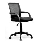 A solid and compact medium mesh back task chair features seat height adjustment, a posture contoured AIRFLOW fabric mesh detailed backrest, upholstered black fabric seat with waterfall front and fixed stylish heavy duty arms.