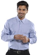 70% cotton/30% polyester. Easy care fabric. Semi-fitted styling. Button down collar. Left breast mitred pocket. Button fastened cuffs that also fit cufflinks, Back yoke with two side pleats. Curved hem.