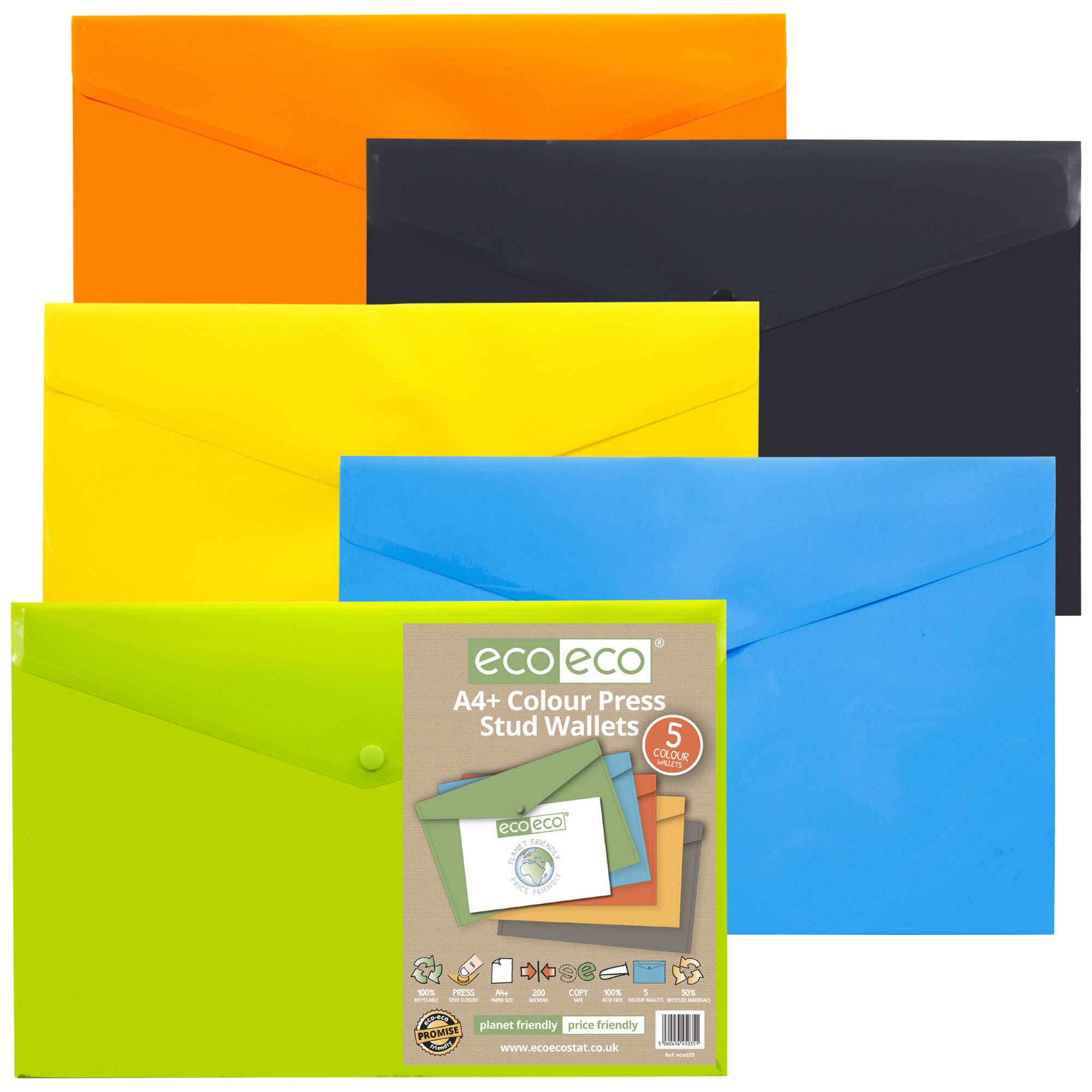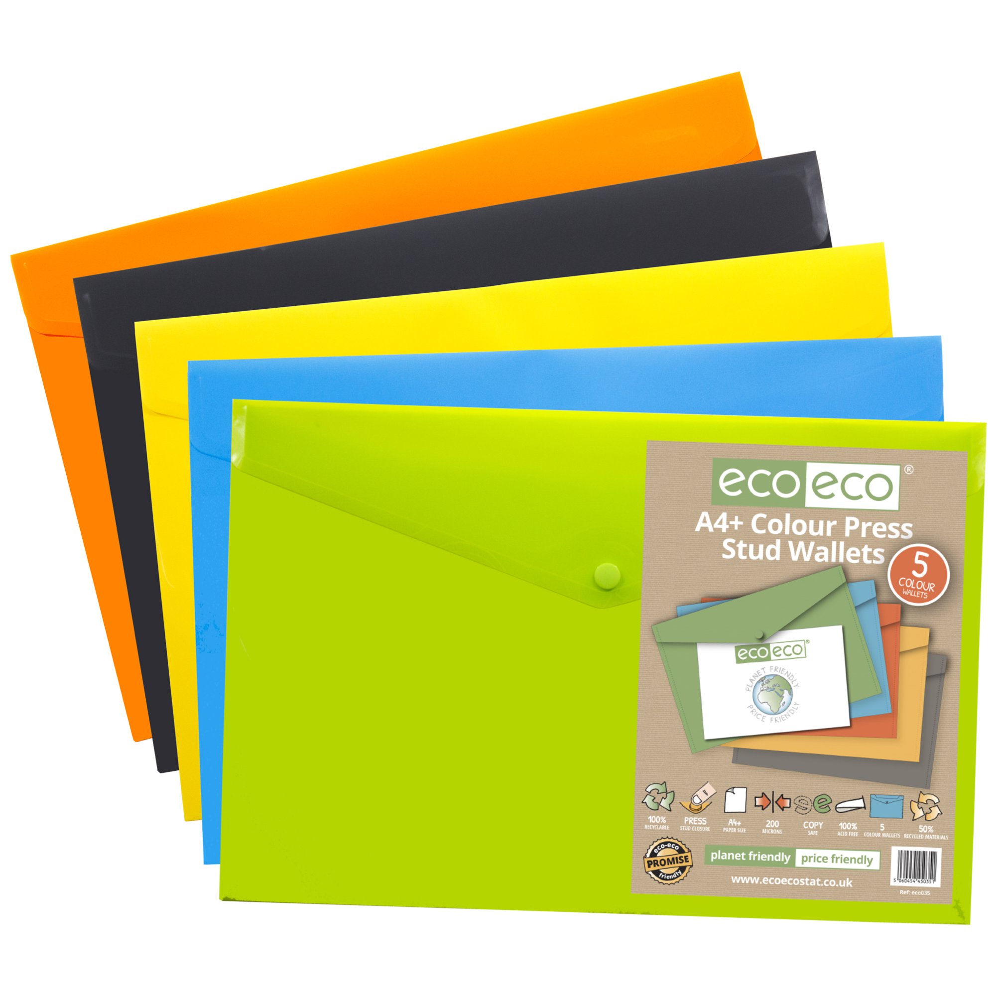 Eco Eco A4+ 50% Recycled Colour Press Stud Wallets – Pack of 5