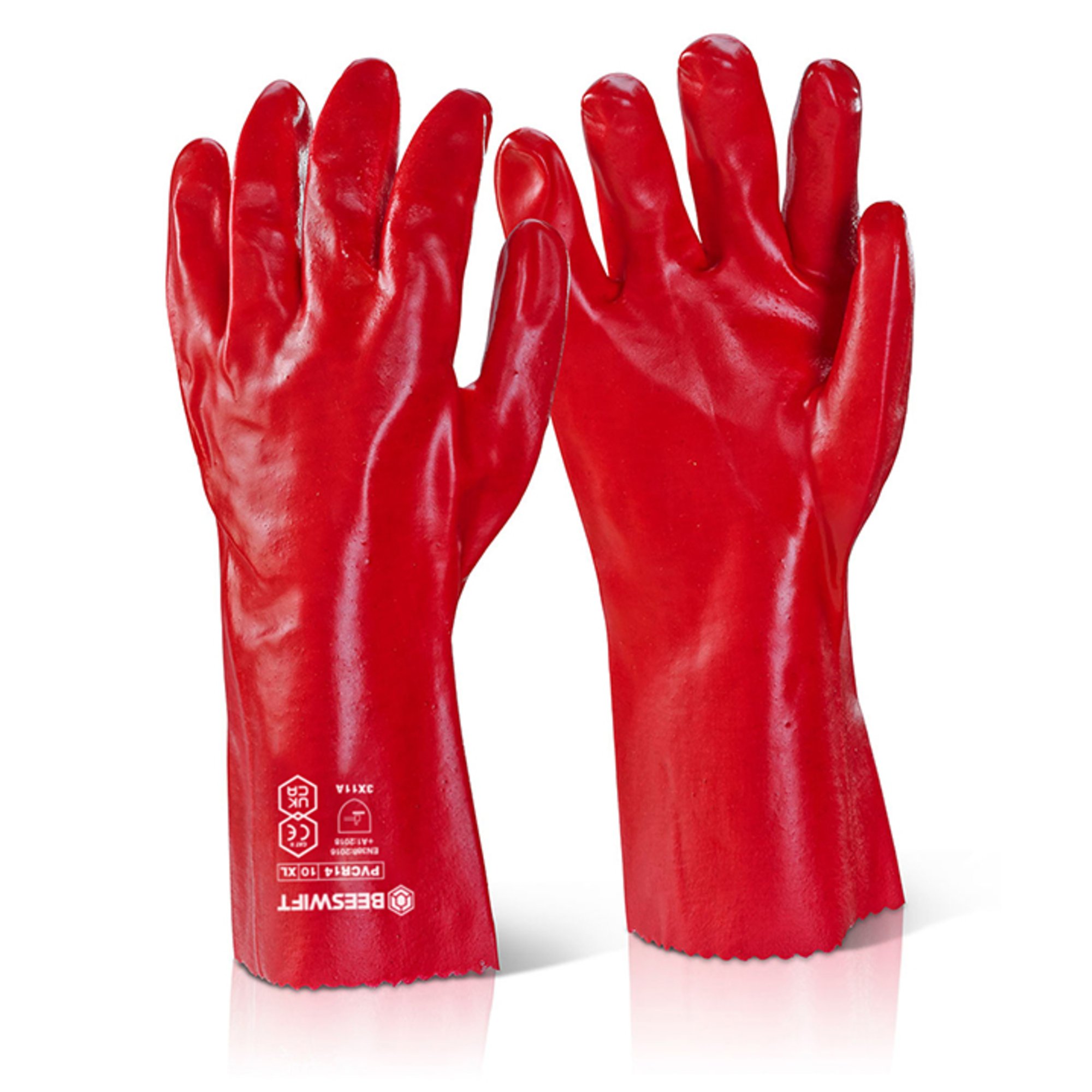 PVC Gauntlet. 11” (28cm) overall length. Liquid proof. EN388: 2016 + A1:2018 Level 4- Abrasion Level X – Cut Resistance Level 1 – Tear Resistance Level 1 – Puncture Level A – ISO 13997 Cut Resistance