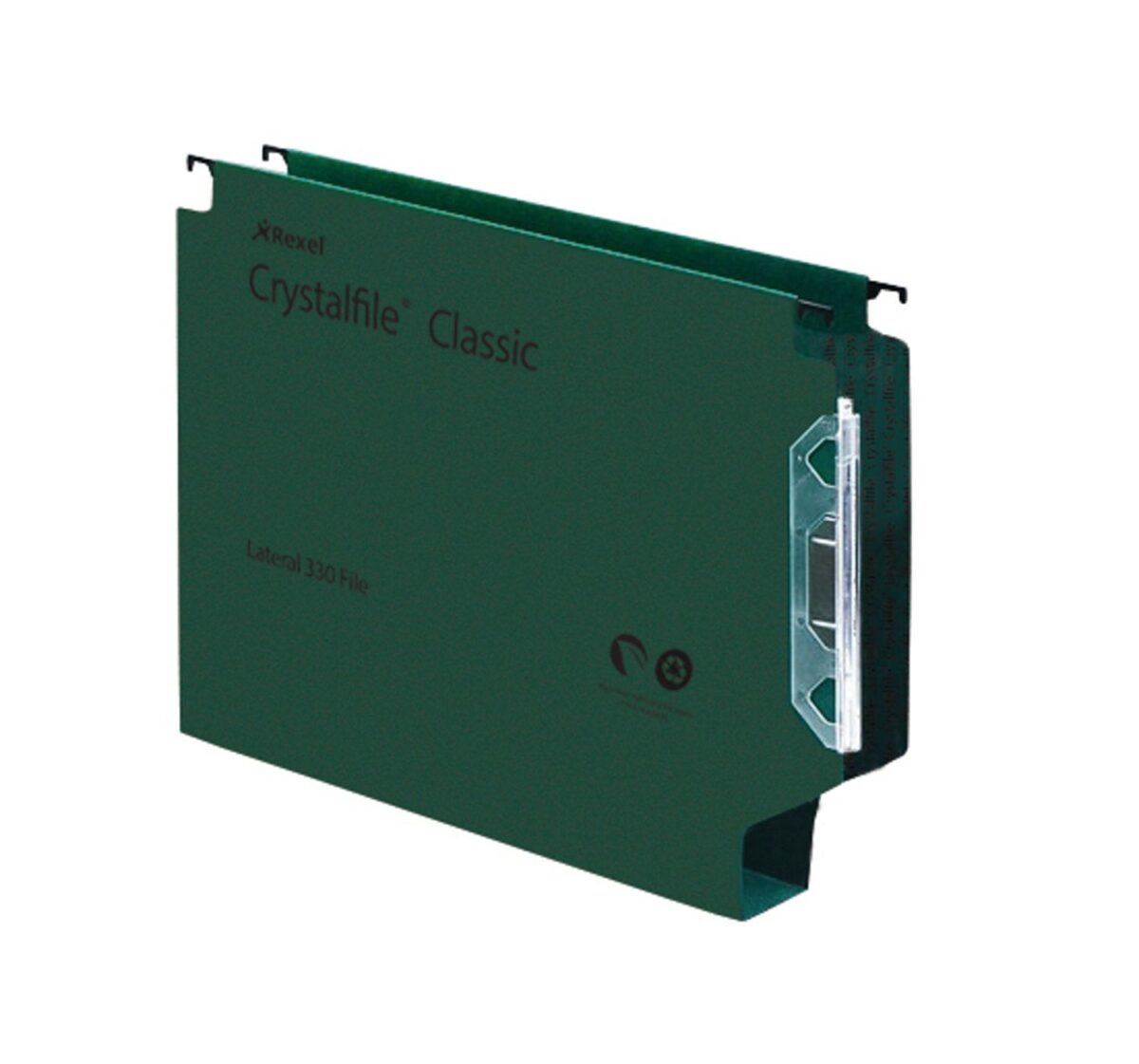 The UK’s best selling suspension files since 1945. Rexel Crystalfile Classic Lateral Suspension Files are made from 100% recycled premium manila with contrasting steel bars. They are supplied with extra long ID tabs and unique printable inserts for easy referencing and the files can be linked together creating a wide opening for easy access to contents Suitable for use in side filing cabinets and cupboards with rails 330mm apart. This high capacity hanging file has a 50mm base, which holds up to 500 A4 sheets (80 gsm). The file dimensions are 330 x 280mm. Available in Green or Orange, 15mm, 30mm & 50mm base widths and a 275mm or 330mm bar width option.