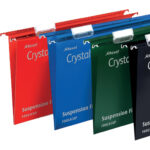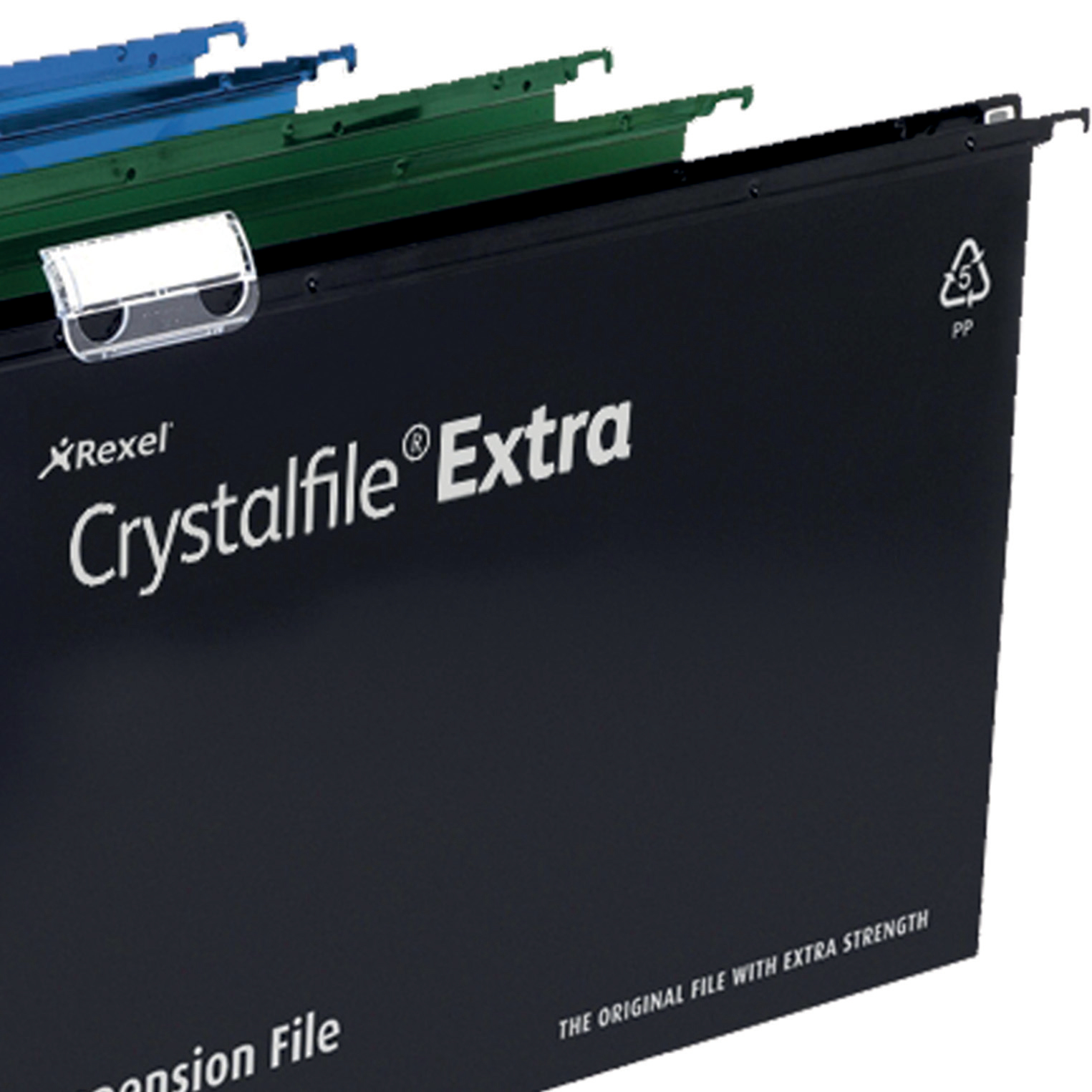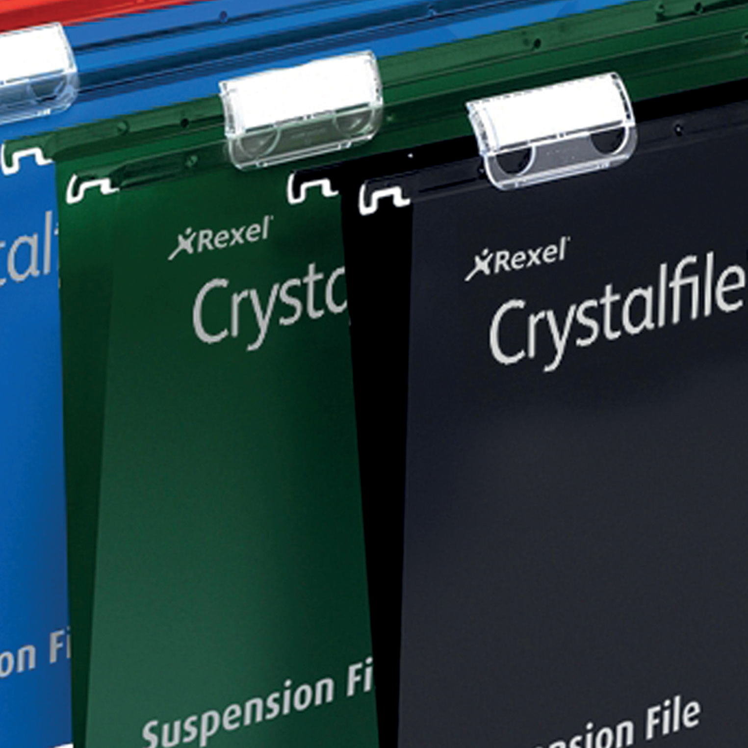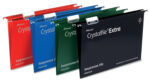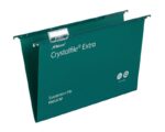 The UK’s best selling suspension files since 1945. Made from tough polypropylene which typically lasts up to 5 times longer than manila. A wipe clean satin finish and matching coloured steel runners for colour coded filing. They are supplied complete with snap proof Crystal Tabs and unique printable inserts for easy referencing. Suitable for filing cabinets, desk drawer chassis and desk top organisers with rails 387mm apart. This Foolscap standard capacity hanging file has a 15mm V-base, which holds up to 150 A4 sheets (80 gsm). The file dimensions are 387 x 240mm, runner length 407mm to allows for easy access to frequently used documents. Available in Green, Blue, Red or Black, with 15mm, 30mm or 50mm base widths and a A4 or Foolscap size option.