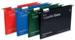The UK’s best selling suspension files since 1945. Made from tough polypropylene which typically lasts up to 5 times longer than manila. A wipe clean satin finish and matching coloured steel runners for colour coded filing. They are supplied complete with snap proof Crystal Tabs and unique printable inserts for easy referencing. Suitable for filing cabinets, desk drawer chassis and desk top organisers with rails 387mm apart. This Foolscap mid-range capacity hanging file has a 30mm base, which holds up to 300 A4 sheets (80 gsm). The file dimensions are 387 x 240mm, runner length 407mm to allows for easy access to frequently used documents. Available in Green, Blue, Red or Black, with 15mm, 30mm or 50mm base widths and a A4 or Foolscap size option.