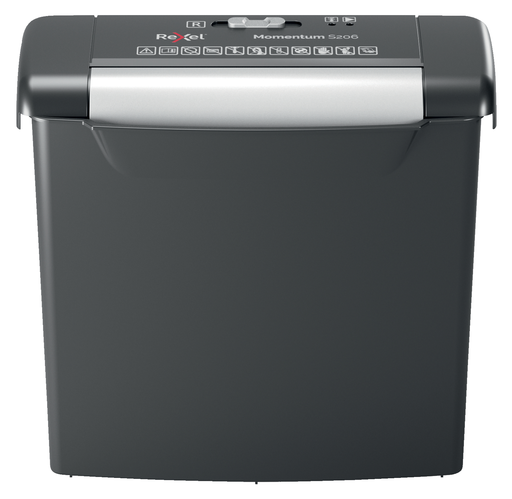 The Rexel Momentum S206 Paper Shredder shreds up to 6 sheets in one go, with a 2 minute continuous run time, making it ideal for home use. P2, Strip Cut 6mm pieces. 9L bin capacity (75 A4 sheets).