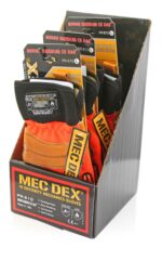 Features, Hi visibility fabric for optimum hand visibility in hazardous conditions, Nails pinch protection with maximum dexterity, Red safety synthetic leather tended wall of finger fourchettes, Flex-vent and Flex-Binding for Fit-Out easy cuff, MECDEX original leather puller Applications, Heavy construction, Agriculture and Farming, Power Tools Handling, Glass and Metal Handling, Tool Pushing, Cut Hazards EN388:2003, Level 4 – Abrasion, Level 5 – Cut Resistance, Level 4 – Tear Resistance, Level 3 – Puncture EN407 4 2 3 X X X