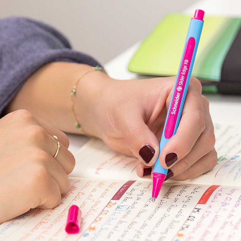 Ballpoint pen with Viscoglide® technology for extraordinarily smooth and gliding writing. Writing colour black. Extra Broad line width (XB). The ink dries quickly – even on smooth paper – and is smudge proof when highlighting it later on. Waterproof according to ink standard ISO 12757-2. Ideally suited to drawing and painting projects because the special ink will not run even on absorbent paper. A generously rubberised three-sided barrel is designed for relaxed writing without hand fatigue. It does not roll on the desk and its slim shape fits perfectly into school children’s pencil cases or into desk pen drawers. The cap fits neatly on either end of pen. The wear-resistant stainless steel tip guarantees that the large ink supply can be fully used and does not smear. The Slider Edge is produced CO2 neutral.