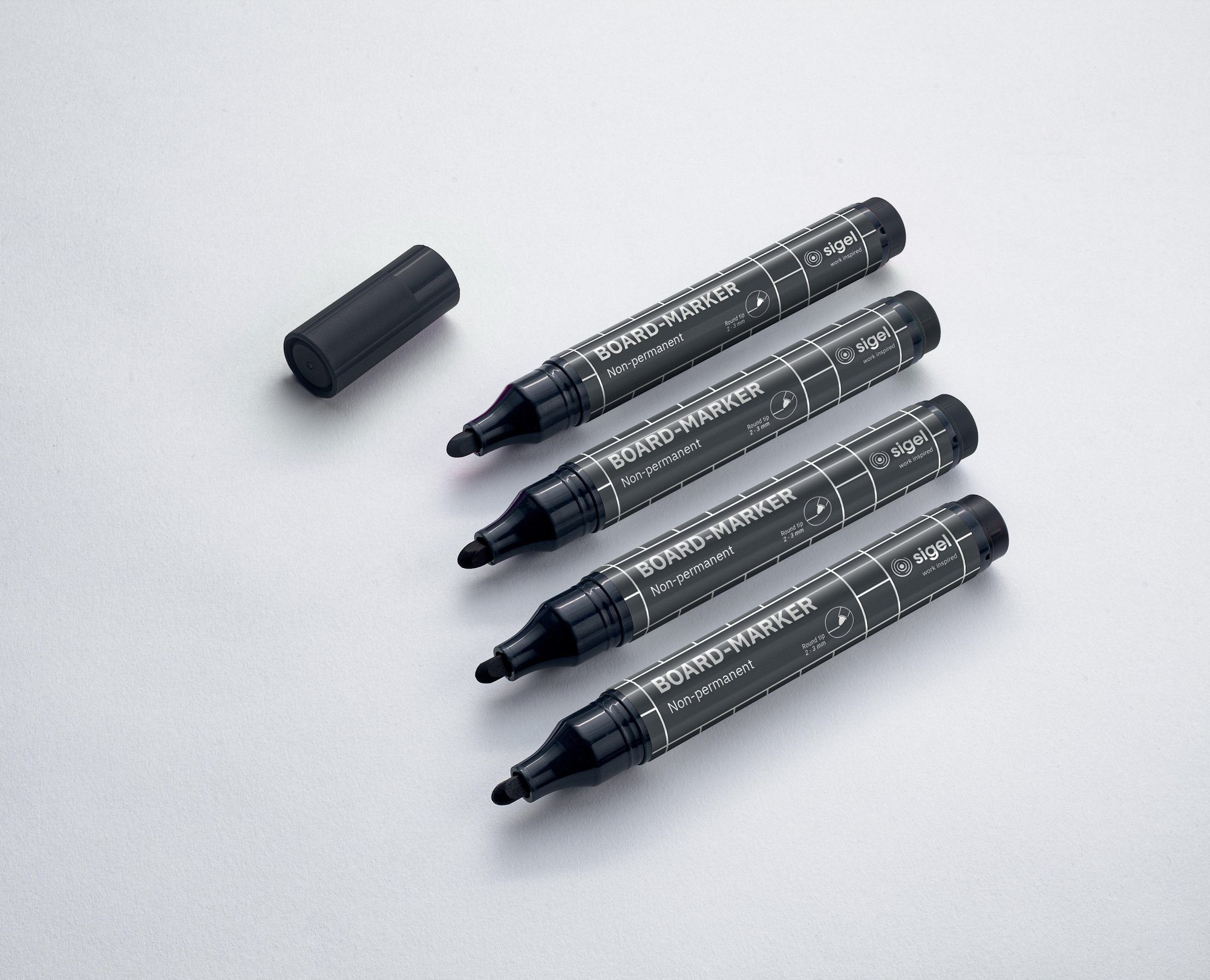 The SIGEL pens come in strong, bright colours and are ideal for writing on smooth surfaces in the office, home office and home. The easy-to-erase board markers (black, odourless ink free of toluene and xylene, set of 4) with round nib (fine, 2-3 mm) write quickly and easily with a wide range of applications for white glass magnet boards, whiteboards and flipcharts.