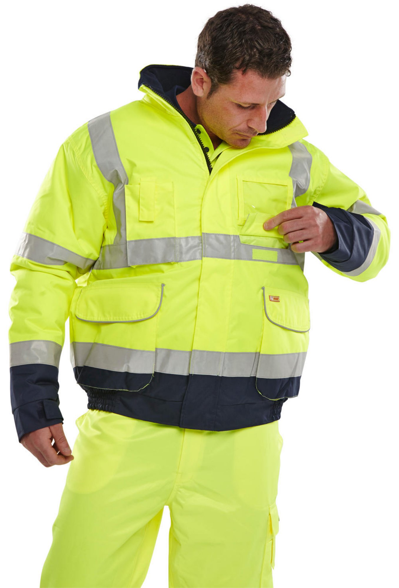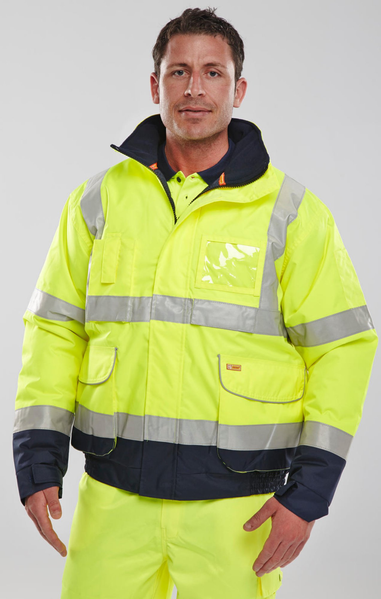 Two Tone Bomber Jacket, 300 Denier outer fabrics with sewn on tape. Heavyweight 100% polyester with PU coating. Two-way heavy duty YKK zip, with storm flap. Fleece lined collar. 2 lower bellows pockets with flaps. Security and phone pockets. ID pocket. Rear hem access for ease of logo applications. Knitted storm cuffs. Concealed Hood. Retro-reflective tape. Conforms to EN343 Class 3 Resistance to Water Pentration Class 1 Air Permeation