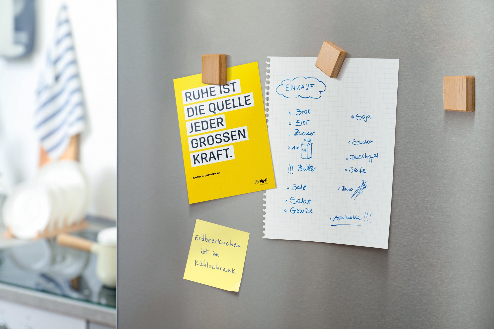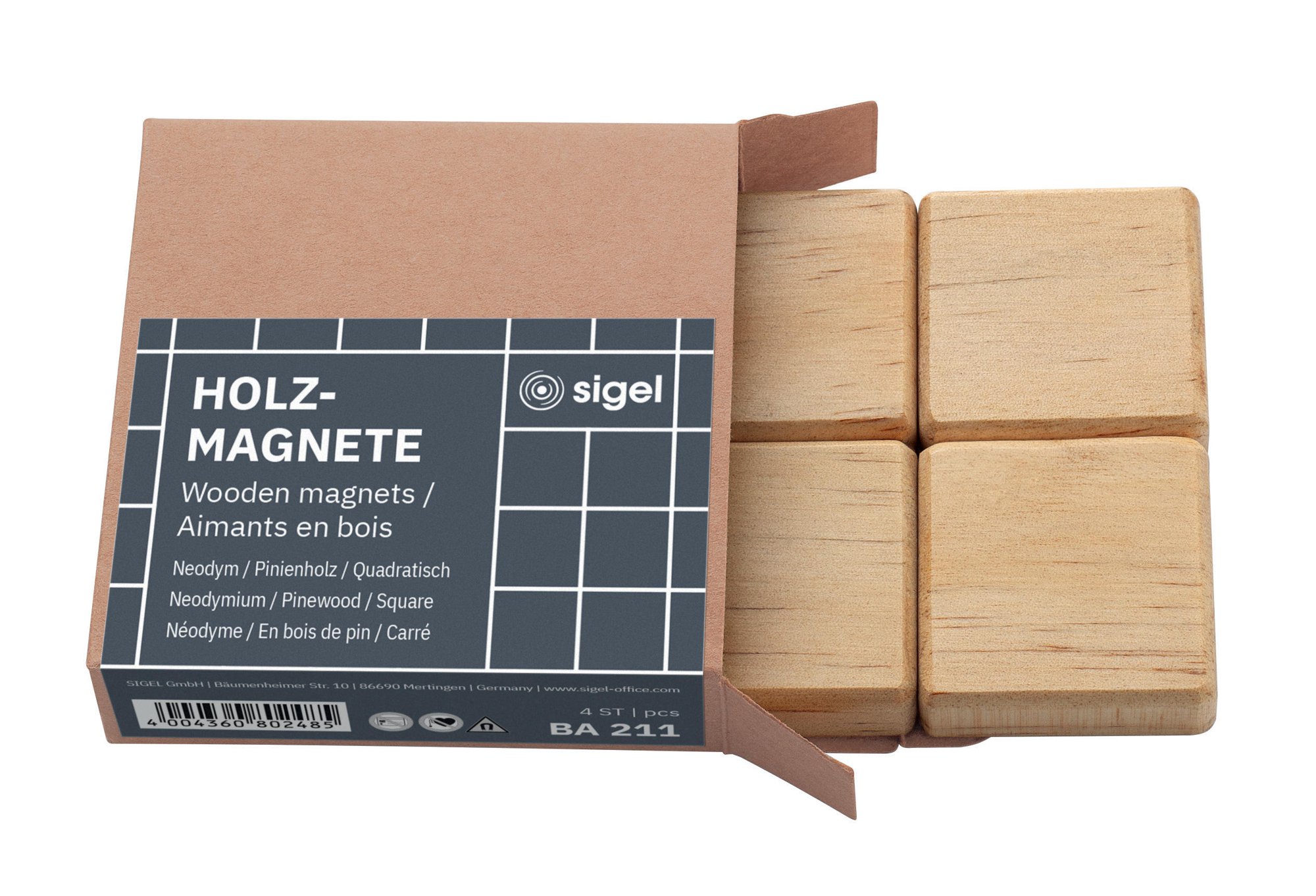 The stylish magnets from the SIGEL range are ideal for the office, home office and home, as they hold securely to whiteboards, magnetic glass boards and metal surfaces. The magnets made of solid wood pine, neodymium (3,3 x 3,3 cm, square, beige), set of 4, hold up to 20 sheets (A4, 80 gsm) on whiteboards and up to 14 sheets (A4, 80 gsm) on magnetic glass boards.