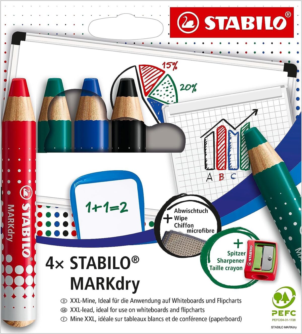 Introducing STABILO MARKdry marker pencil for use on whiteboards, chalkboards, show me boards, glass and flipcharts – with constant bright colour output until the last stroke. The MARKdry can be wiped off non-porous surfaces with a damp or dry cloth (included in the pack) and easily washes off hands and clothes.