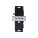 Dual power options, DC jack and terminal block, provide installation flexibility and convenience. The converter is housed in a full metal enclosure for durability in harsh environments. The DB9 over IP converter includes all necessary wall and DIN rail mounting hardware. Multiple mounting holes along the chassis allow it to be installed in the most useful orientation for any application. Dimensions of 7×2.3×0.9in (178×59.4x23mm).
