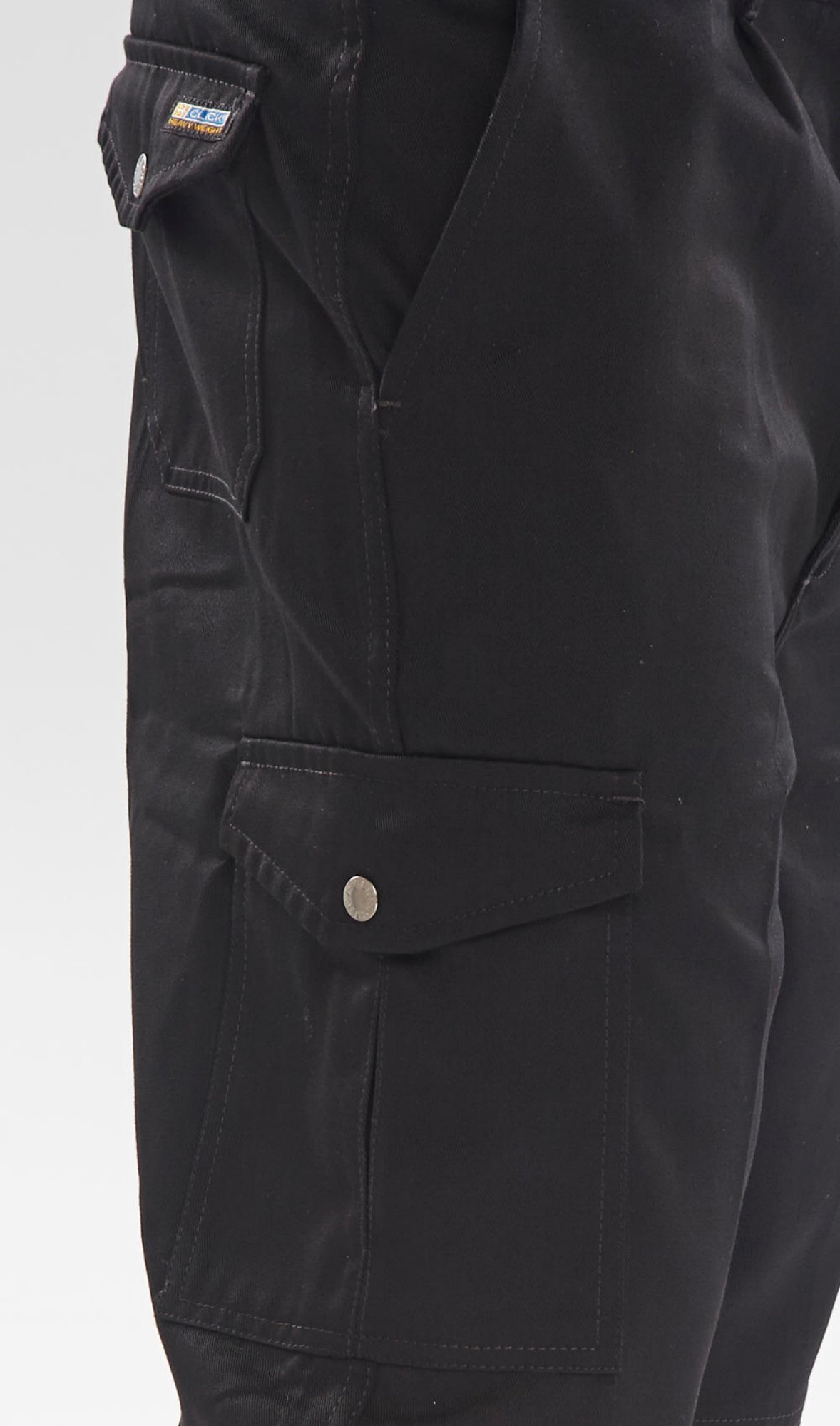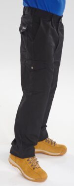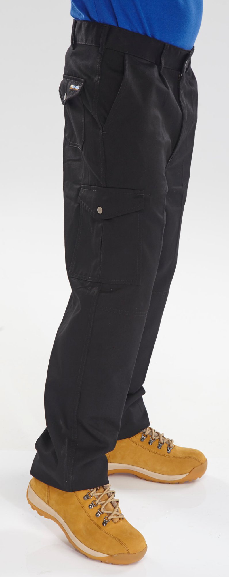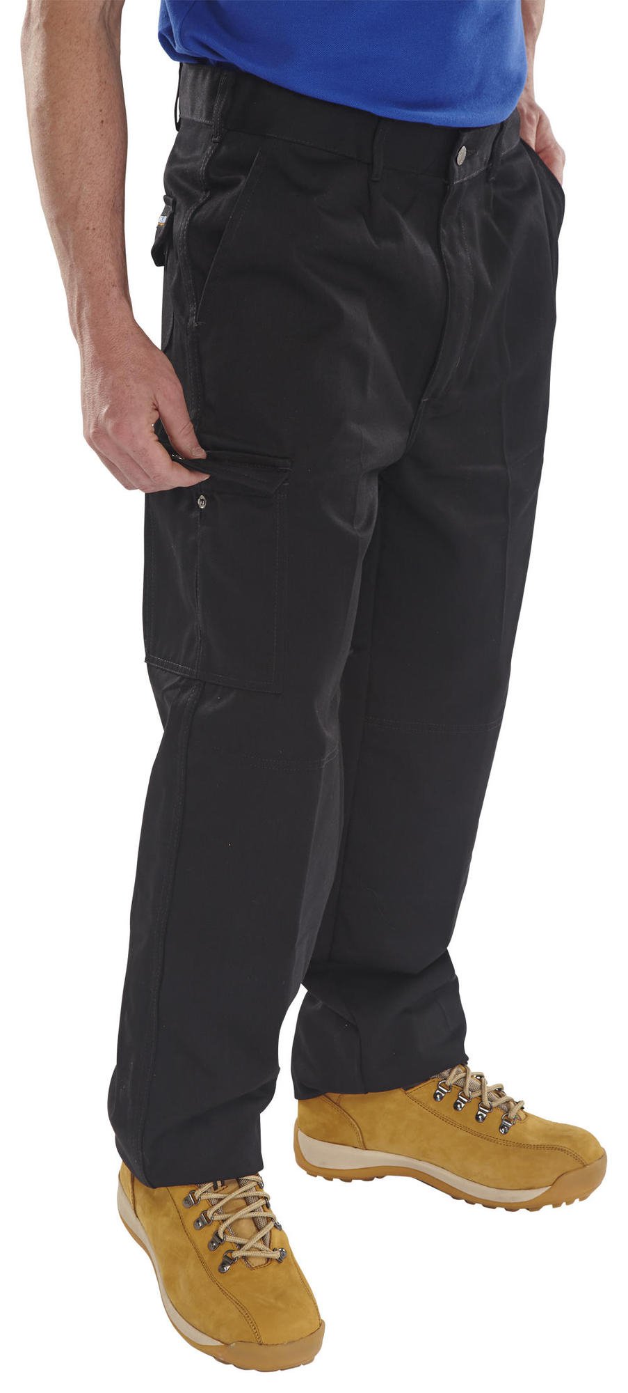 9oz 65% Polyester, 35% Cotton, 7 Belt loops, Metal button waist fastening, No. 5 YKK brass zip, 2 front pleats, 2 side hip pockets, Singular pleated leg pocket with stud flap, 2 rear pockets with stud closure, 1 rear rule pocket, Knee pad pockets