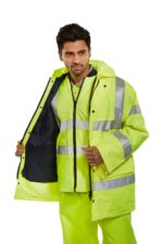 Outer Jacket -, Conforms to EN ISO20471 Class 3 High Visibility, Conforms to EN 343 Class 3 Water Penetration Class 1 Air Permeability, Heavyweight PU coated polyester. Nylon lining. Concealed hood. Two-way heavy weight zip with storm flap. 2 Lower hip pockets with flaps. Knitted storm cuffs. Fully taped seams. Inner Bodywarmer -, EN ISO20471 Class 2 High Visibility, PU coating to hi-vis side. Reversible bodywarmer ‘zipout’. Knitted collar. Heavy duty zip. Navy polycotton diamond quilt on reverse. 2 patch pockets on quilted side. Fully taped seams. Reflective Material.