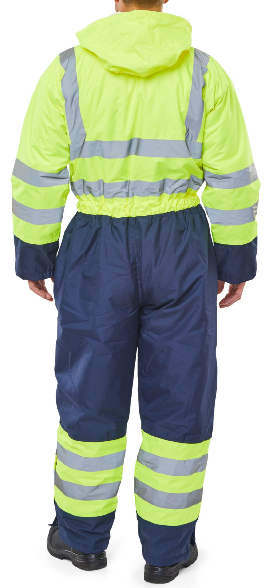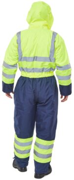Two Tone Quilted Coverall, 300 Denier outer fabrics with sewn on tape. Heavyweight 100% polyester with PU coating. Two-way heavy duty YKK zip, with stud fastened storm flap. 2 Front stud fastened pockets. 2 leg cargo pockets with stud fastening. Security and phone pockets. Rear hem access for ease of logo applications. Concealed Hood. Retro-reflective tape. Conforms to EN ISO 20471 – Class 3. Conforms to EN 343 – Class 3 1. Conforms to EN 342 – Icler 0.474 Air Permeability – Class 2